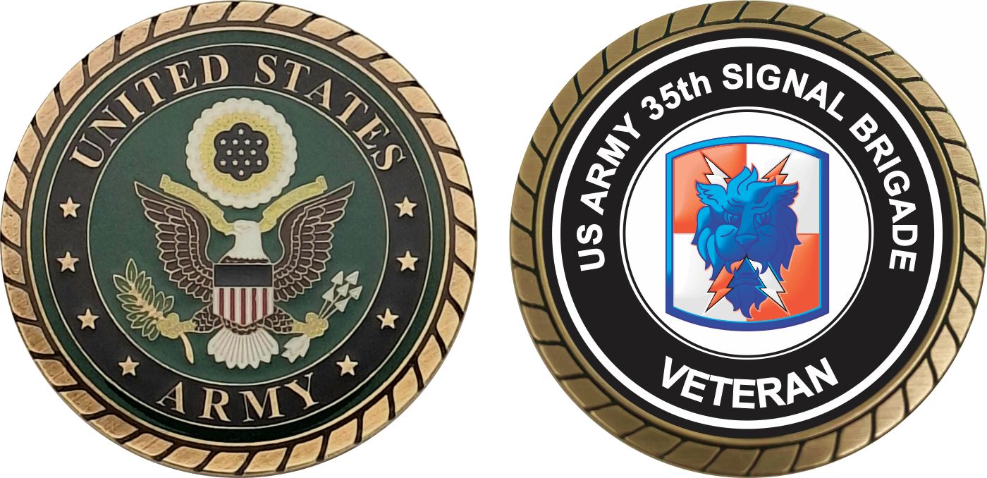 This 1 3/4” U.S. Army 35th Signal Brigade Veteran Challenge Coin is proudly offered by MilitaryBest. This Officially Licensed Army coin has beautiful enamel finish on one side and an organized crisp clean U.S. Army 35th Signal Brigade Veteran design on the opposite side.