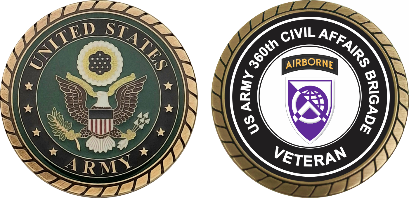 This 1 3/4” U.S. Army 360th Civil Affairs Airborne Brigade Veteran Challenge Coin is proudly offered by MilitaryBest. This Officially Licensed Army coin has beautiful enamel finish on one side and an organized crisp clean U.S. Army 360th Civil Affairs Airborne Brigade Veteran design on the opposite side.