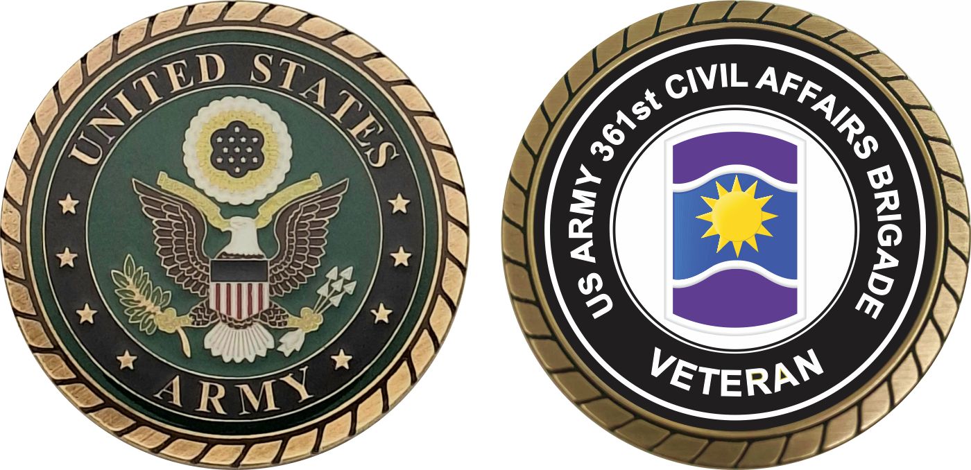 This 1 3/4” U.S. Army 361st Civil Affairs Brigade Veteran Challenge Coin is proudly offered by MilitaryBest. This Officially Licensed Army coin has beautiful enamel finish on one side and an organized crisp clean U.S. Army 361st Civil Affairs Brigade Veteran design on the opposite side.