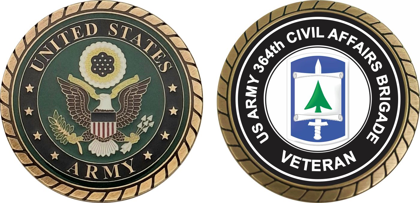 This 1 3/4” U.S. Army 364th Civil Affairs Brigade Veteran Challenge Coin is proudly offered by MilitaryBest. This Officially Licensed Army coin has beautiful enamel finish on one side and an organized crisp clean U.S. Army 364th Civil Affairs Brigade Veteran design on the opposite side.