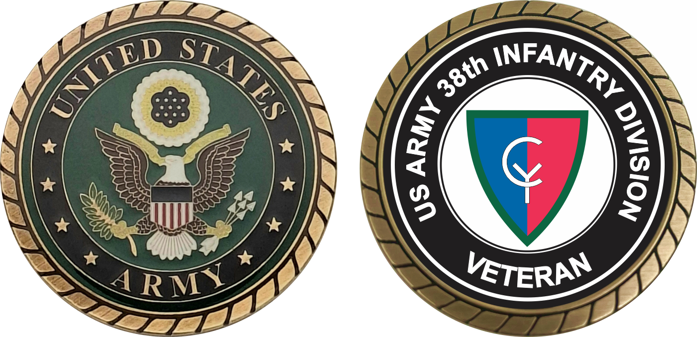 This 1 3/4” U.S. Army 38th Infantry Division Veteran Challenge Coin is proudly offered by Militarybest. This Officially Licensed Army coin has beautiful enamel finish on one side and an organized crisp clean 38th Infantry Division Veteran design on the opposite side.