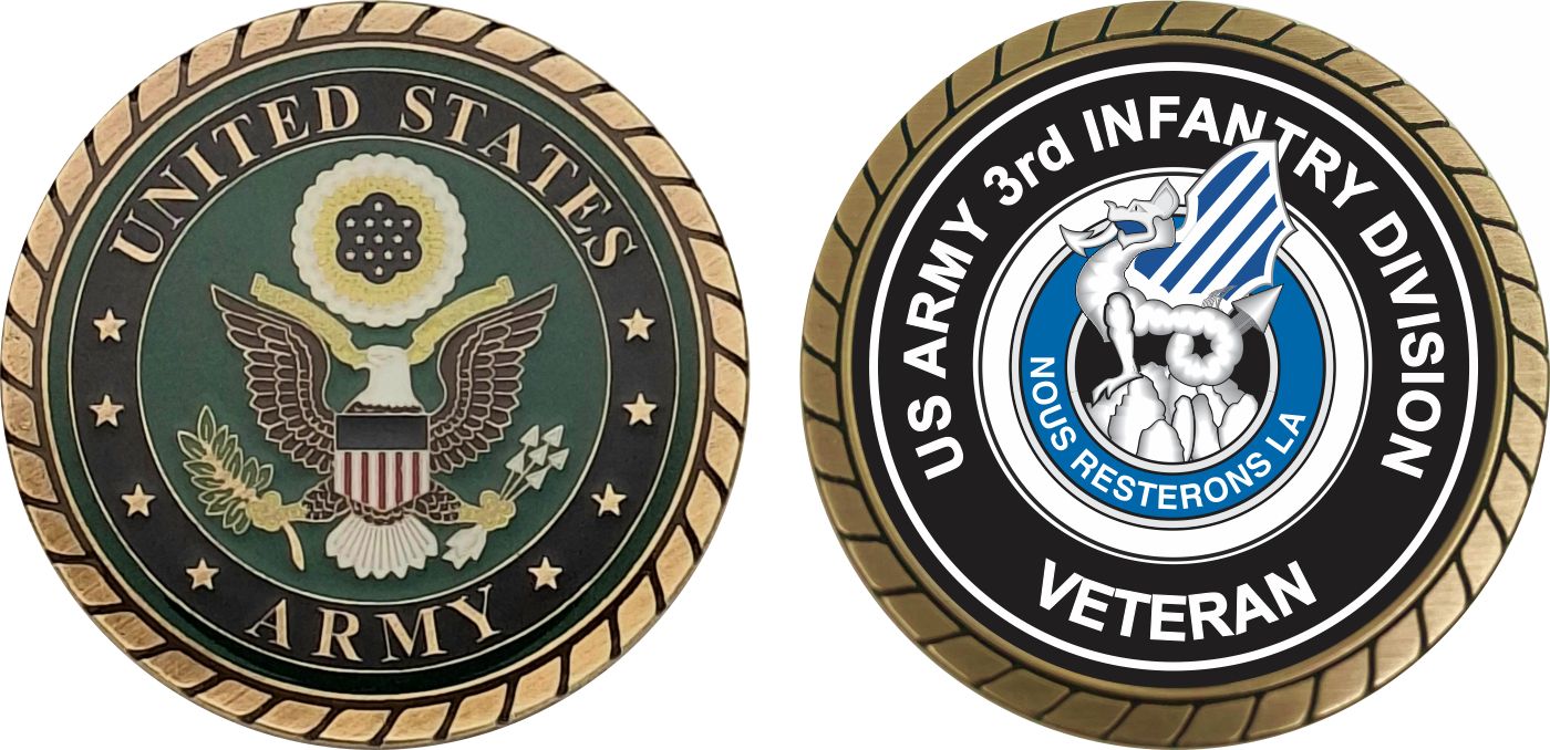 This 1 3/4” U.S. Army 3rd Infantry Division Unit Crest Veteran Challenge Coin is proudly offered by Militarybest. This Officially Licensed Army coin has beautiful enamel finish on one side and an organized crisp clean 3rd Infantry Division Unit Crest Veteran design on the opposite side.