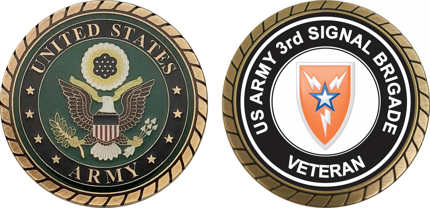 This 1 3/4” U.S. Army 3rd Signal Brigade Veteran Challenge Coin is proudly offered by MilitaryBest. This Officially Licensed Army coin has beautiful enamel finish on one side and an organized crisp clean U.S. Army 3rd Signal Brigade Veteran design on the opposite side.