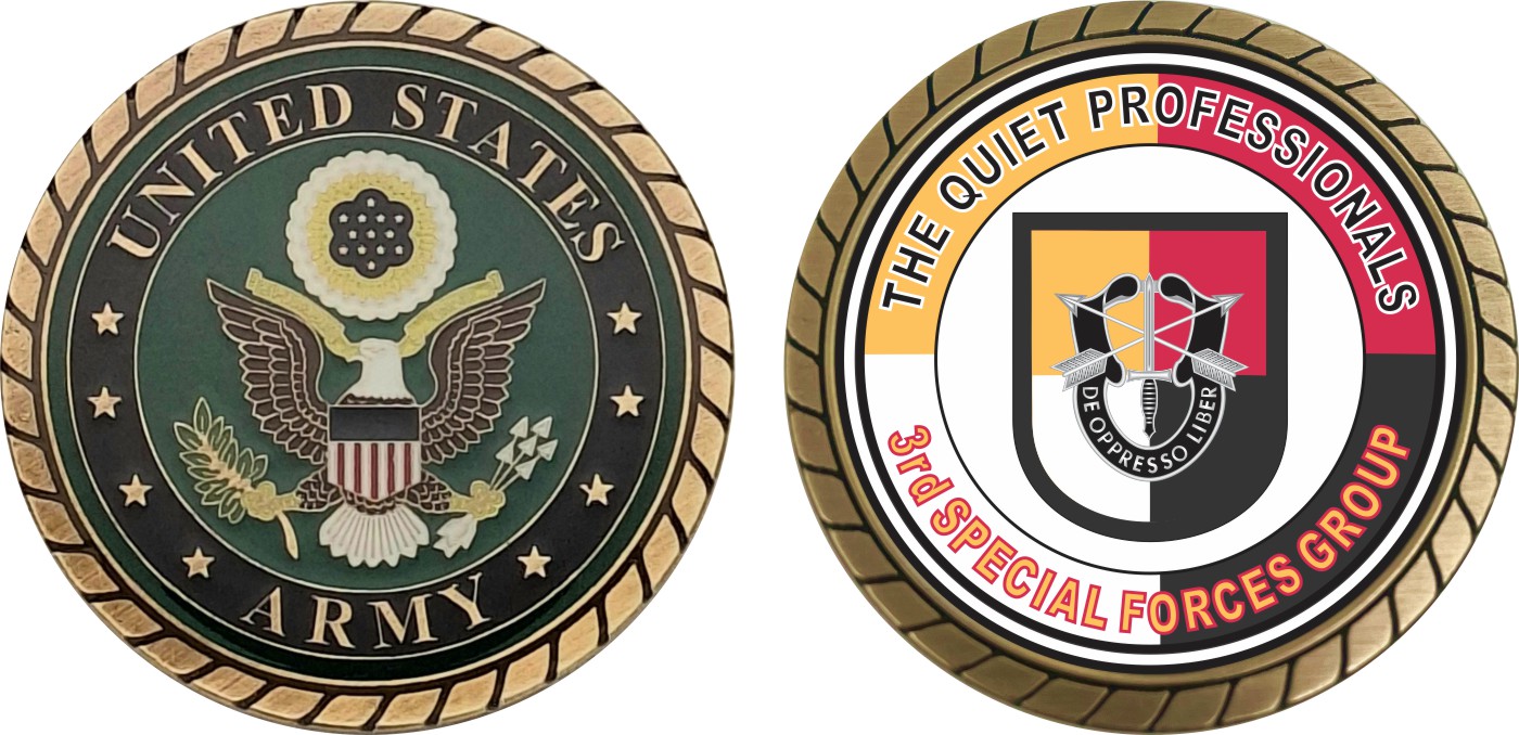 This 1 3/4” U.S. Army 3rd Special Forces Group Quiet Professionals Challenge Coin is proudly offered by Militarybest. This Officially Licensed Army coin has beautiful enamel finish on one side and an organized crisp clean design on the opposite side.
