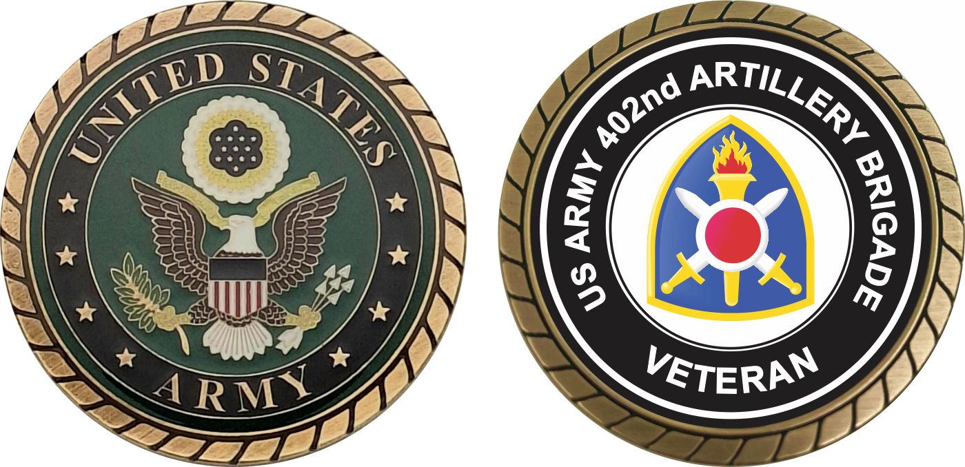 This 1 3/4” U.S. Army 402nd Artillery Brigade Veteran Challenge Coin is proudly offered by MilitaryBest. This Officially Licensed Army coin has beautiful enamel finish on one side and an organized crisp clean U.S. Army 402nd Artillery Brigade Veteran design on the opposite side.