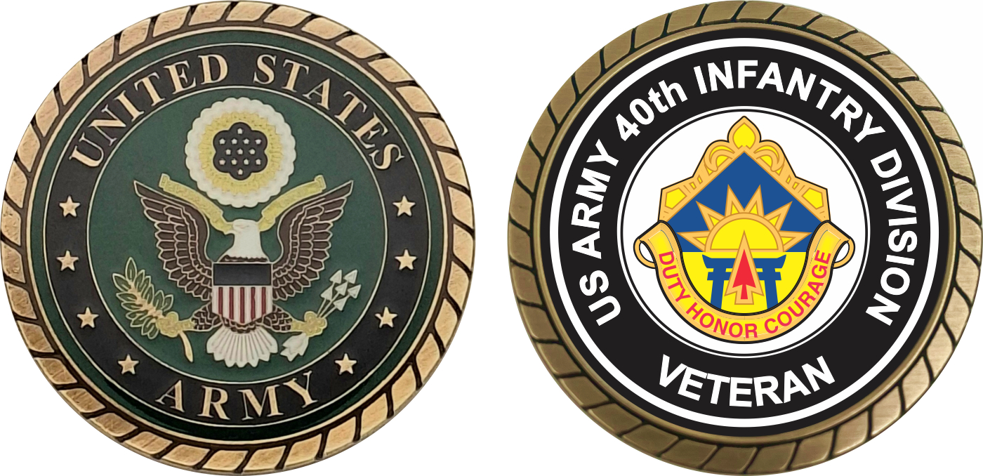 This 1 3/4” U.S. Army 40th Infantry Division Unit Crest Veteran Challenge Coin is proudly offered by Militarybest. This Officially Licensed Army coin has beautiful enamel finish on one side and an organized crisp clean 40th Infantry Division Unit Crest Veteran design on the opposite side.