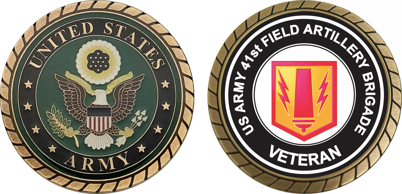 This 1 3/4” U.S. Army 41st Field Artillery Brigade Veteran Challenge Coin is proudly offered by MilitaryBest. This Officially Licensed Army coin has beautiful enamel finish on one side and an organized crisp clean U.S. Army 41st Field Artillery Brigade Veteran design on the opposite side.