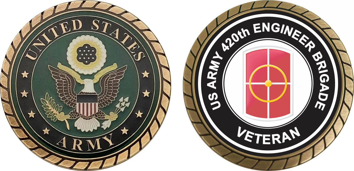 This 1 3/4” U.S. Army 420th Engineer Brigade Veteran Challenge Coin is proudly offered by MilitaryBest. This Officially Licensed Army coin has beautiful enamel finish on one side and an organized crisp clean U.S. Army 420th Engineer Brigade Veteran design on the opposite side.