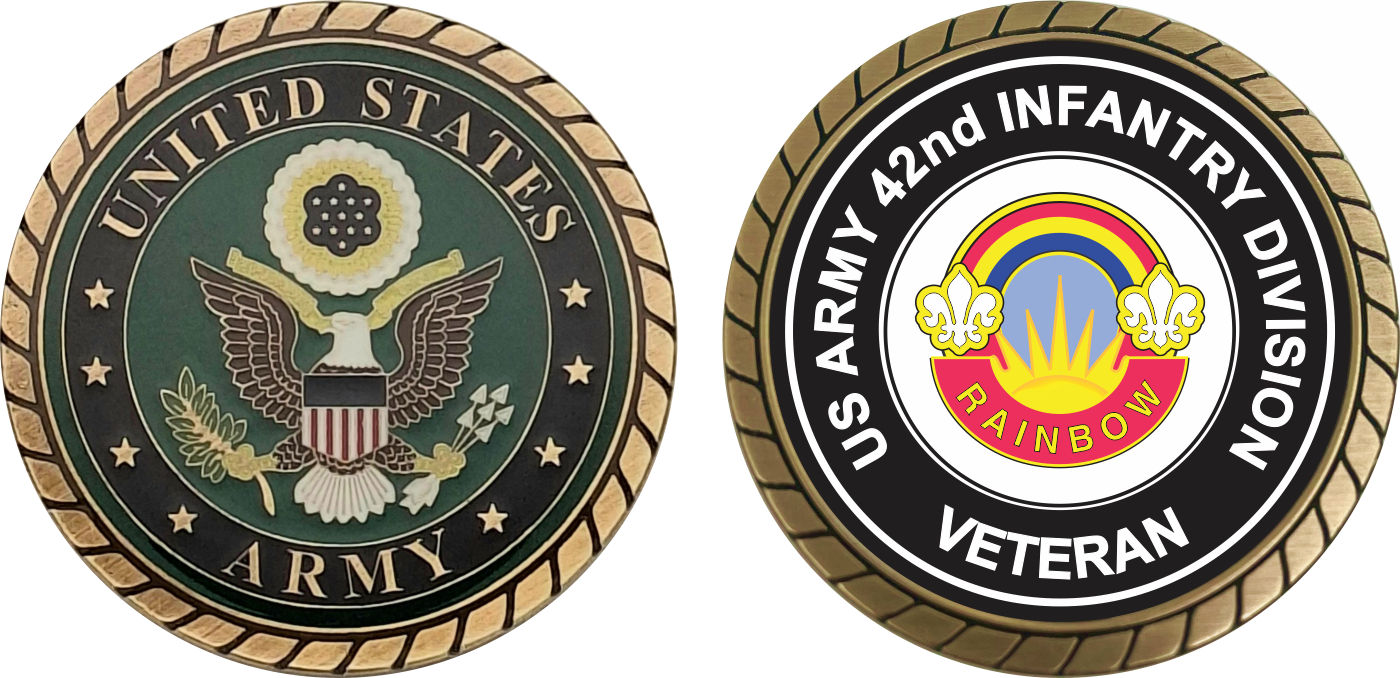This 1 3/4” U.S. Army 42nd Infantry Division Unit Crest Veteran Challenge Coin is proudly offered by Militarybest. This Officially Licensed Army coin has beautiful enamel finish on one side and an organized crisp clean 42nd Infantry Division Unit Crest Veteran design on the opposite side.