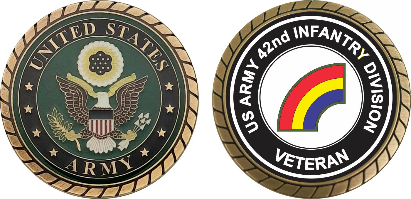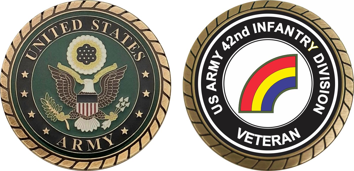 This 1 3/4” U.S. Army 42nd Infantry Division Veteran Challenge Coin is proudly offered by Militarybest. This Officially Licensed Army coin has beautiful enamel finish on one side and an organized crisp clean 42nd Infantry Division Veteran design on the opposite side.