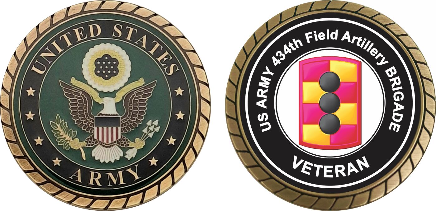 This 1 3/4” U.S. Army 434th Field Artillery Brigade Veteran Challenge Coin is proudly offered by MilitaryBest. This Officially Licensed Army coin has beautiful enamel finish on one side and an organized crisp clean U.S. Army 434th Field Artillery Brigade Veteran design on the opposite side.