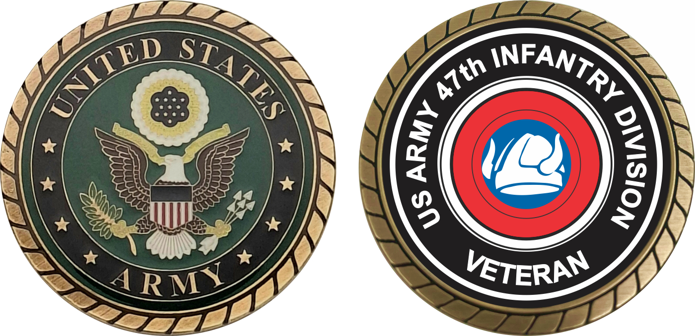 This 1 3/4” U.S. Army 47th Infantry Division Veteran Challenge Coin is proudly offered by Militarybest. This Officially Licensed Army coin has beautiful enamel finish on one side and an organized crisp clean 47th Infantry Division Veteran design on the opposite side.