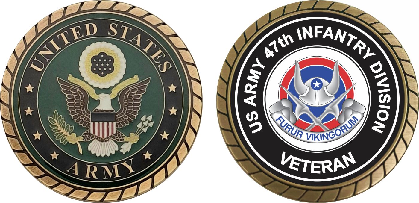 This 1 3/4” U.S. Army 47th Infantry Unit Crest Veteran Challenge Coin is proudly offered by Militarybest. This Officially Licensed Army coin has beautiful enamel finish on one side and an organized crisp clean 47th Infantry Unit Crest Veteran design on the opposite side.