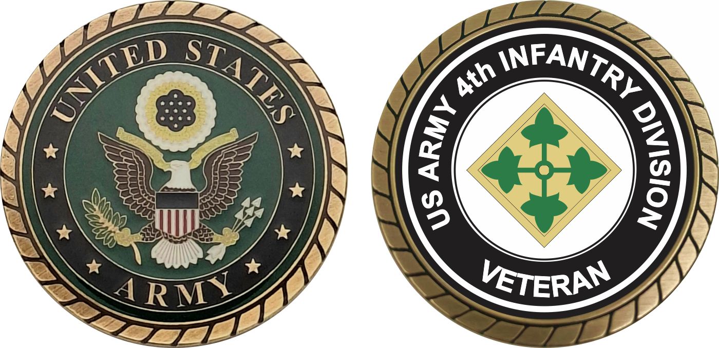 This 1 3/4” U.S. Army 4th Infantry Division Veteran Challenge Coin is proudly offered by Militarybest. This Officially Licensed Army coin has beautiful enamel finish on one side and an organized crisp clean 4th Infantry Division Veteran design on the opposite side.