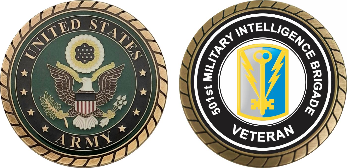This 1 3/4” U.S. Army 501st Military Intelligence Brigade Veteran Challenge Coin is proudly offered by MilitaryBest. This Officially Licensed Army coin has beautiful enamel finish on one side and an organized crisp clean U.S. Army 501st Military Intelligence Brigade Veteran design on the opposite side.