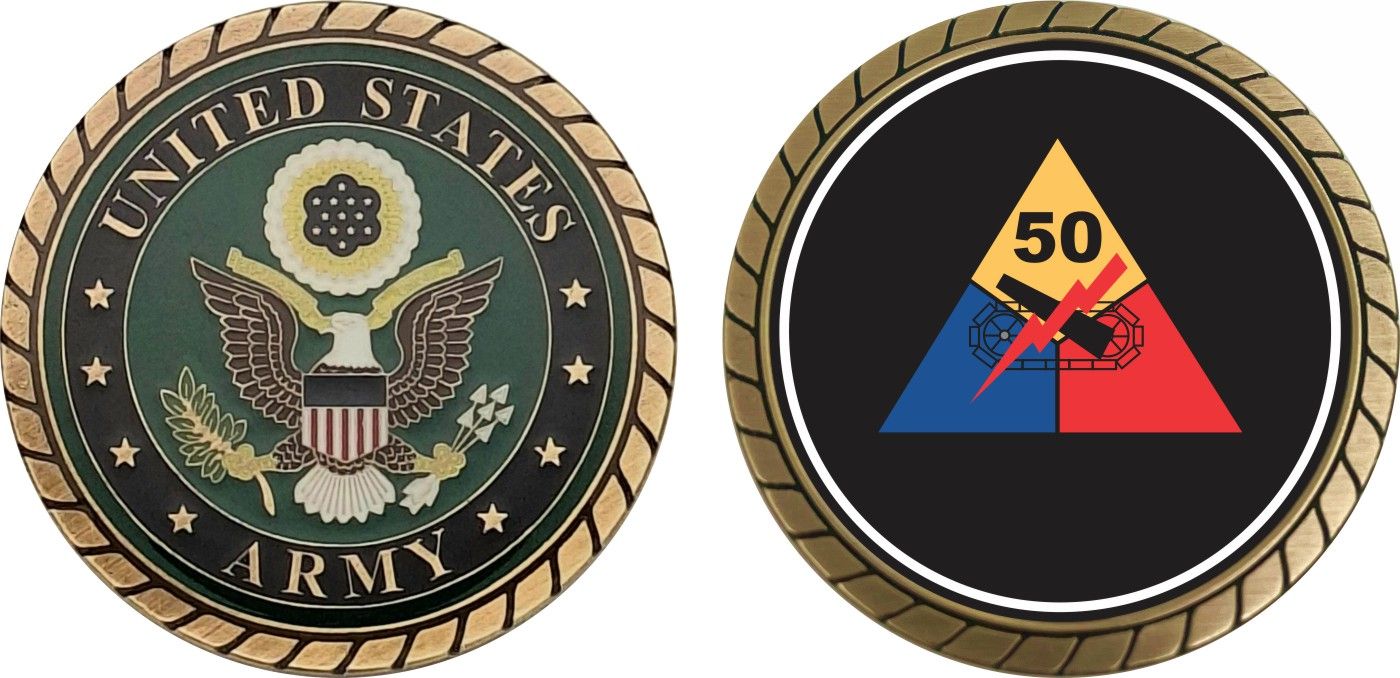 This 1 3/4” U.S. Army 50th Armored Division Challenge Coin is proudly offered by Militarybest. This Officially Licensed Army coin has beautiful enamel finish on one side and an organized crisp clean design on the opposite side.