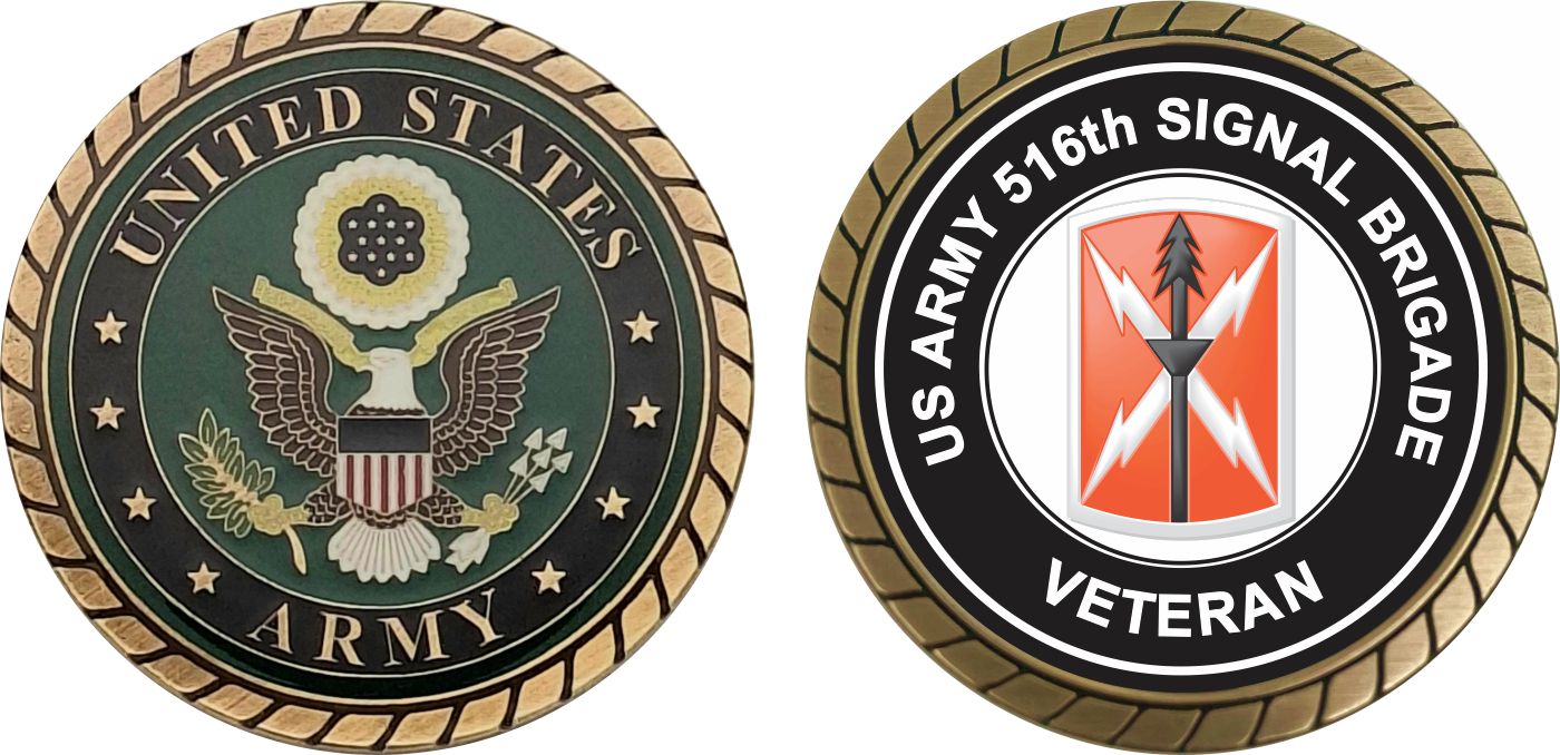This 1 3/4” U.S. Army 516th Signal Brigade Veteran Challenge Coin is proudly offered by MilitaryBest. This Officially Licensed Army coin has beautiful enamel finish on one side and an organized crisp clean U.S. Army 516th Signal Brigade Veteran design on the opposite side.
