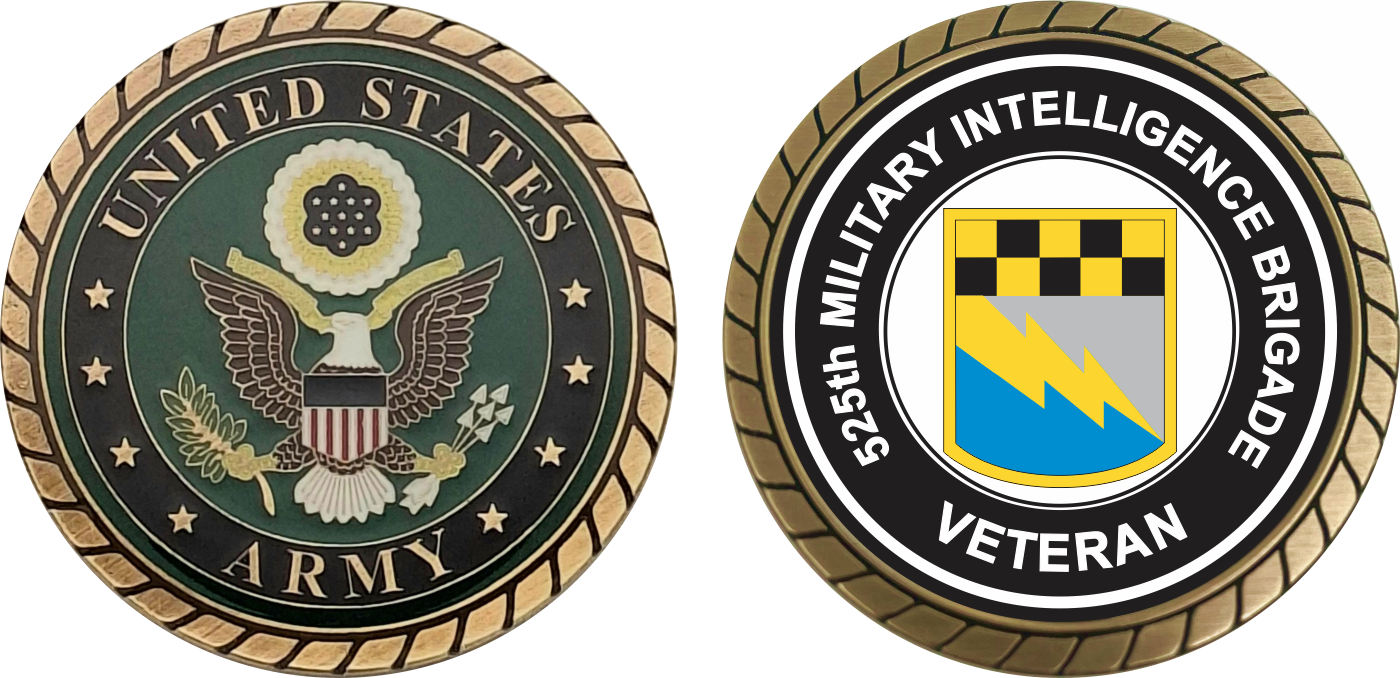 This 1 3/4” U.S. Army 525th Military Intelligence Brigade Veteran Challenge Coin is proudly offered by MilitaryBest. This Officially Licensed Army coin has beautiful enamel finish on one side and an organized crisp clean U.S. Army 525th Military Intelligence Brigade Veteran design on the opposite side.