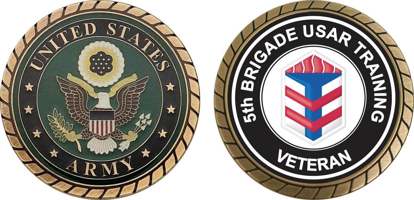 This 1 3/4” U.S. Army 5th Brigade USAR Training Veteran Challenge Coin is proudly offered by MilitaryBest. This Officially Licensed Army coin has beautiful enamel finish on one side and an organized crisp clean U.S. Army 5th Brigade USAR Training Veteran design on the opposite side.