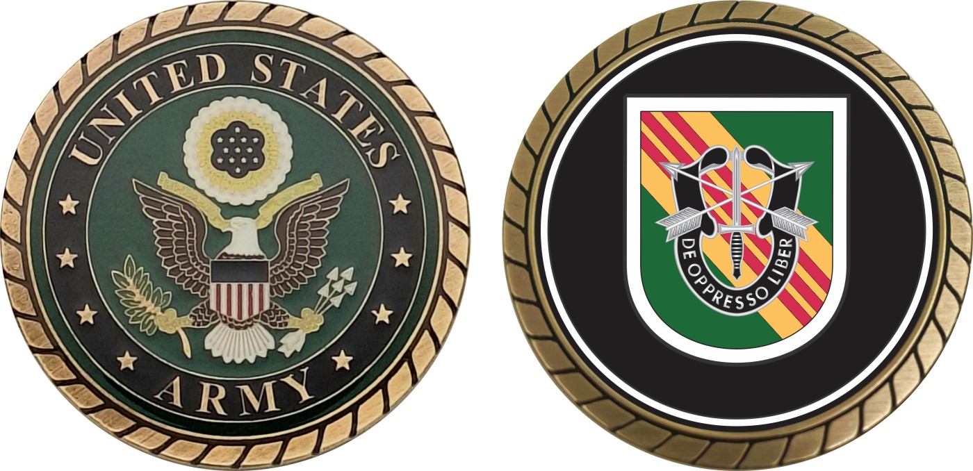 This 1 3/4” U.S. Army 5th Special Forces Group Flash Challenge Coin is proudly offered by Militarybest. This Officially Licensed Army coin has beautiful enamel finish on one side and an organized crisp clean design on the opposite side.