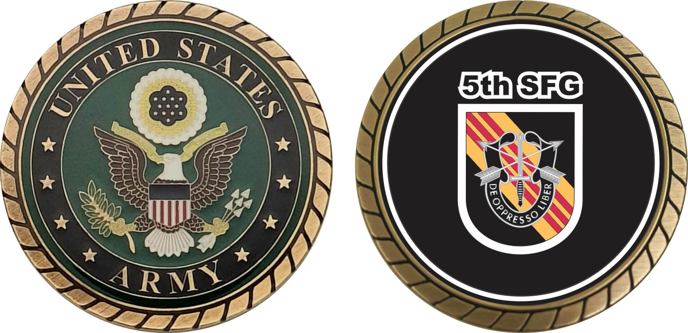 This 1 3/4” U.S. Army 5th Special Forces Group Vietnam Challenge Coin is proudly offered by Militarybest. This Officially Licensed Army coin has beautiful enamel finish on one side and an organized crisp clean design on the opposite side.