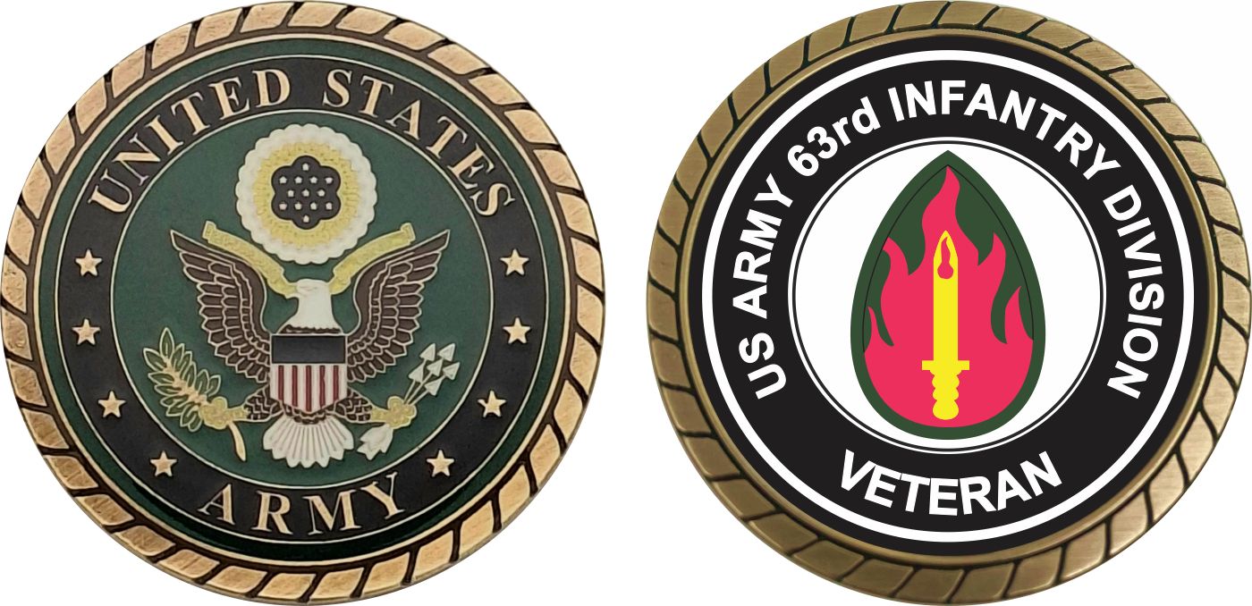 This 1 3/4” U.S. Army 63rd Infantry Division Veteran Challenge Coin is proudly offered by Militarybest. This Officially Licensed Army coin has beautiful enamel finish on one side and an organized crisp clean 63rd Infantry Division Veteran design on the opposite side.