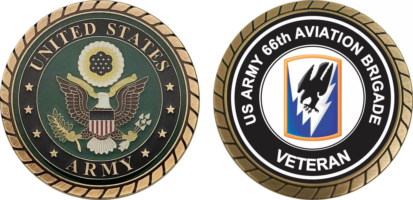 This 1 3/4” U.S. Army 66th Aviation Brigade Veteran Challenge Coin is proudly offered by MilitaryBest. This Officially Licensed Army coin has beautiful enamel finish on one side and an organized crisp clean U.S. Army 66th Aviation Brigade Veteran design on the opposite side.