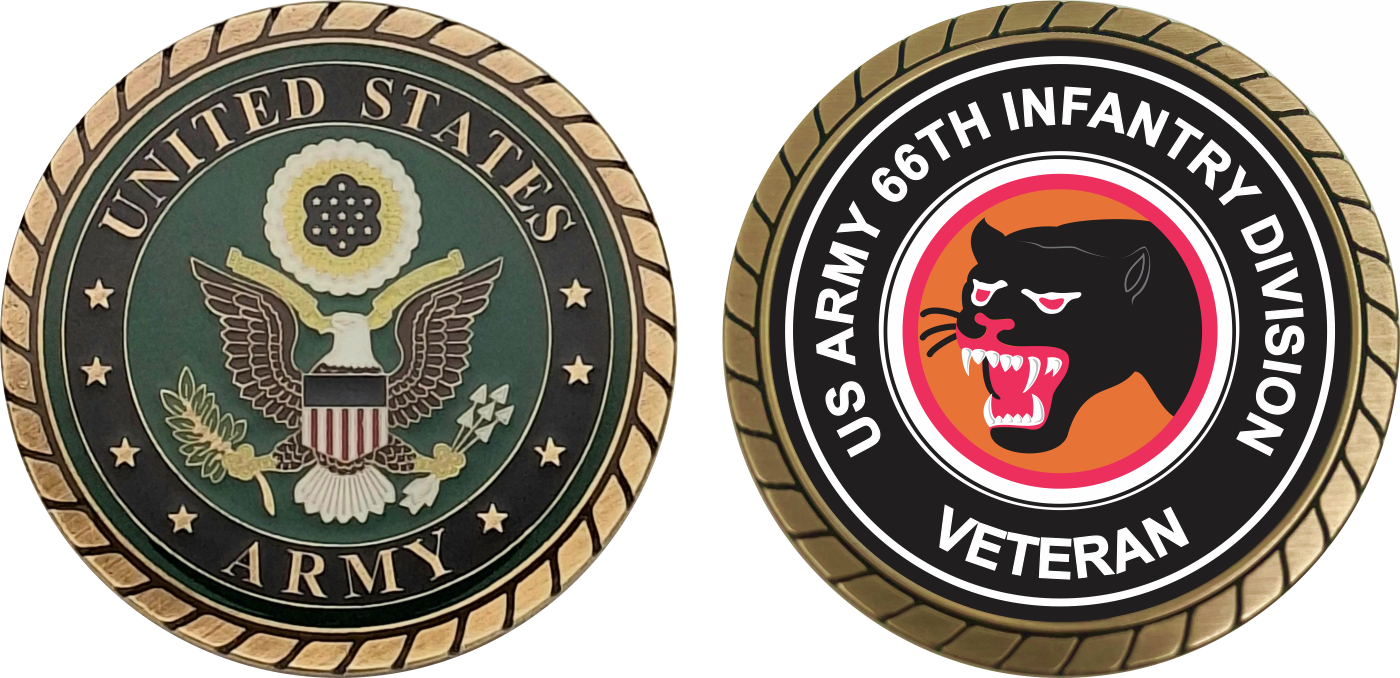 This 1 3/4” U.S. Army 66th Infantry Division Veteran Challenge Coin is proudly offered by Militarybest. This Officially Licensed Army coin has beautiful enamel finish on one side and an organized crisp clean 66th Infantry Division Veteran design on the opposite side.