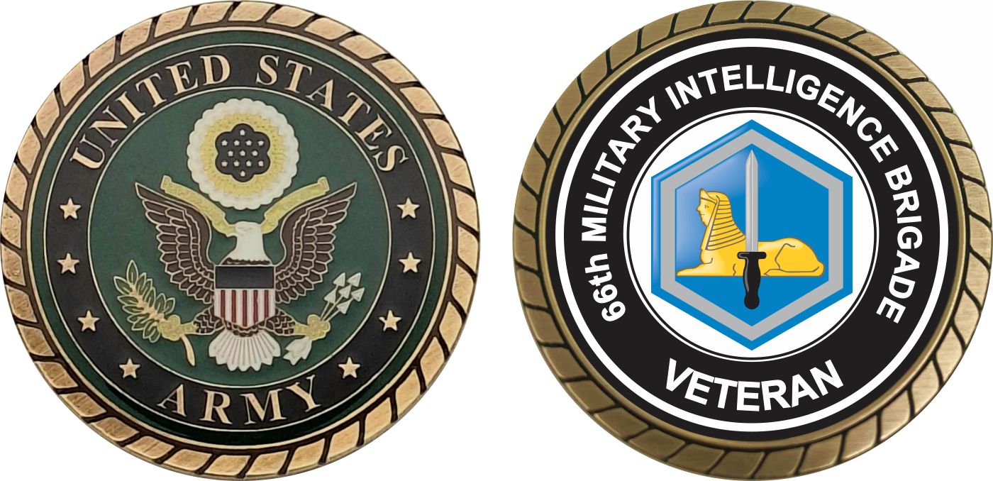 This 1 3/4” U.S. Army 66th Military Intelligence Brigade Veteran Challenge Coin is proudly offered by MilitaryBest. This Officially Licensed Army coin has beautiful enamel finish on one side and an organized crisp clean U.S. Army 66th Military Intelligence Brigade Veteran design on the opposite side.