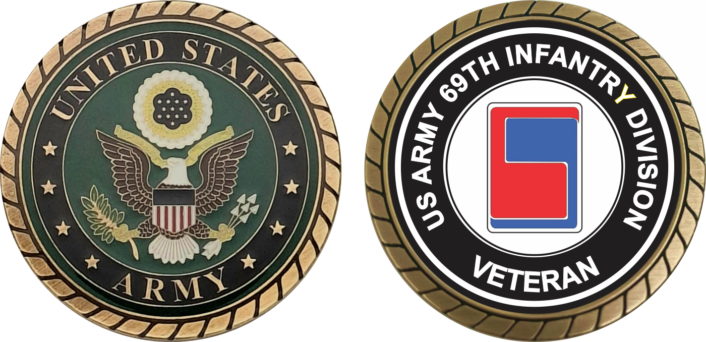 This 1 3/4” U.S. Army 69th Infantry Division Veteran Challenge Coin is proudly offered by Militarybest. This Officially Licensed Army coin has beautiful enamel finish on one side and an organized crisp clean 69th Infantry Division Veteran design on the opposite side.