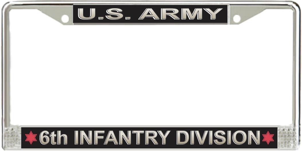 U.S. Army 6th Infantry Division License Plate FrameThis U.S. Army 6th Infantry Division License Plate Frame is made from the highest quality finished metal alloy. Each one is designed to provide years of use. Each is designed and produced in our facility in Scottsboro, Alabama.