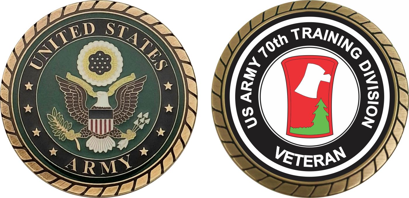 This 1 3/4” U.S. Army 70th Training Division Veteran Challenge Coin is proudly offered by Militarybest. This Officially Licensed Army coin has beautiful enamel finish on one side and an organized crisp clean 70th Training Division Veteran design on the opposite side.