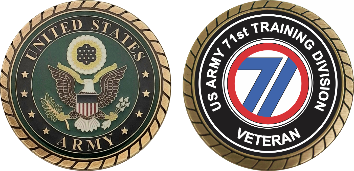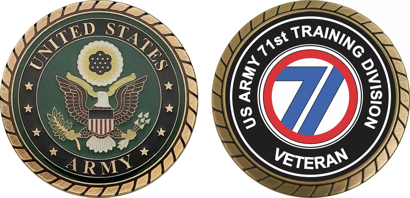 This 1 3/4” U.S. Army 71st Training Division Veteran Challenge Coin is proudly offered by Militarybest. This Officially Licensed Army coin has beautiful enamel finish on one side and an organized crisp clean 71st Training Division Veteran design on the opposite side.