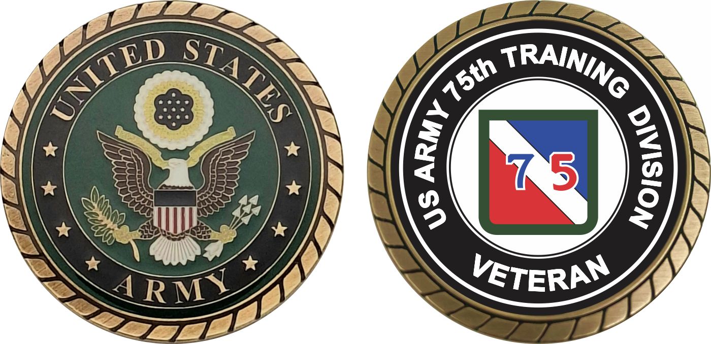 This 1 3/4” U.S. Army 75th Infantry Division Veteran Challenge Coin is proudly offered by Militarybest. This Officially Licensed Army coin has beautiful enamel finish on one side and an organized crisp clean 75th Infantry Division Veteran design on the opposite side.