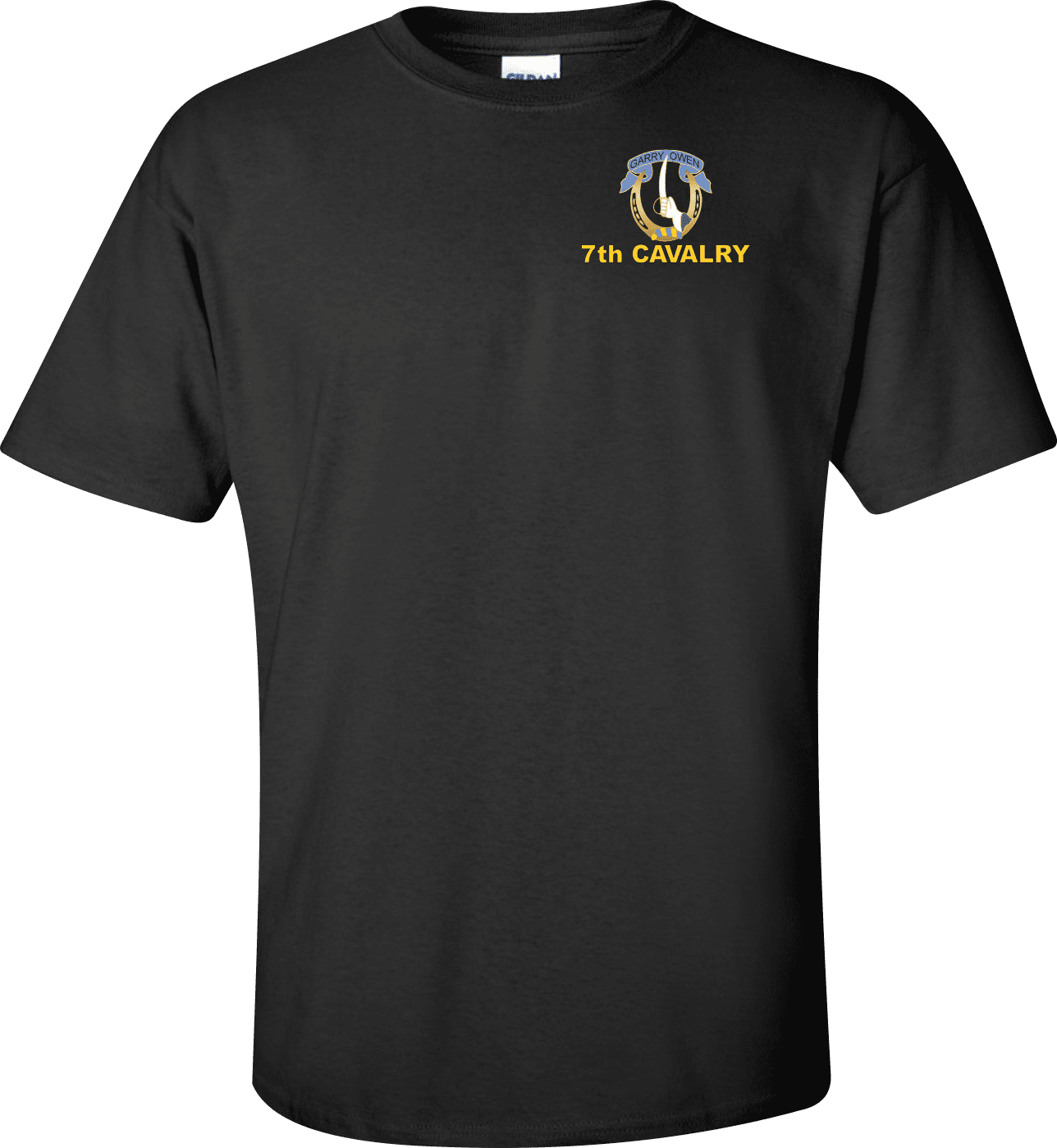 MilitaryBest is proud to offer this fine U.S. Army 7th Cavalry Regiment T-shirt. This shirt is available with several options for the image on the front of the shirt, as well as, offering a full-sized Insignia on the back. Each U.S. Army 7th Cavalry Regiment T-shirt is proudly printed in the USA.Unless there is a defect in workmanship or material, these shirts are unreturnable.