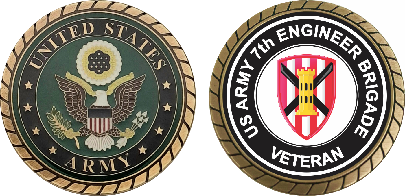 This 1 3/4” U.S. Army 7th Engineer Brigade Veteran Challenge Coin is proudly offered by MilitaryBest. This Officially Licensed Army coin has beautiful enamel finish on one side and an organized crisp clean U.S. Army 7th Engineer Brigade Veteran design on the opposite side.