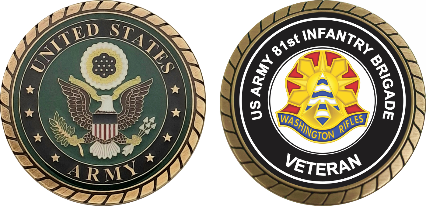 This 1 3/4” U.S. Army 81st Infantry Brigade Unit Crest Veteran Challenge Coin is proudly offered by MilitaryBest. This Officially Licensed Army coin has beautiful enamel finish on one side and an organized crisp clean U.S. Army 81st Infantry Brigade Unit Crest Veteran design on the opposite side.