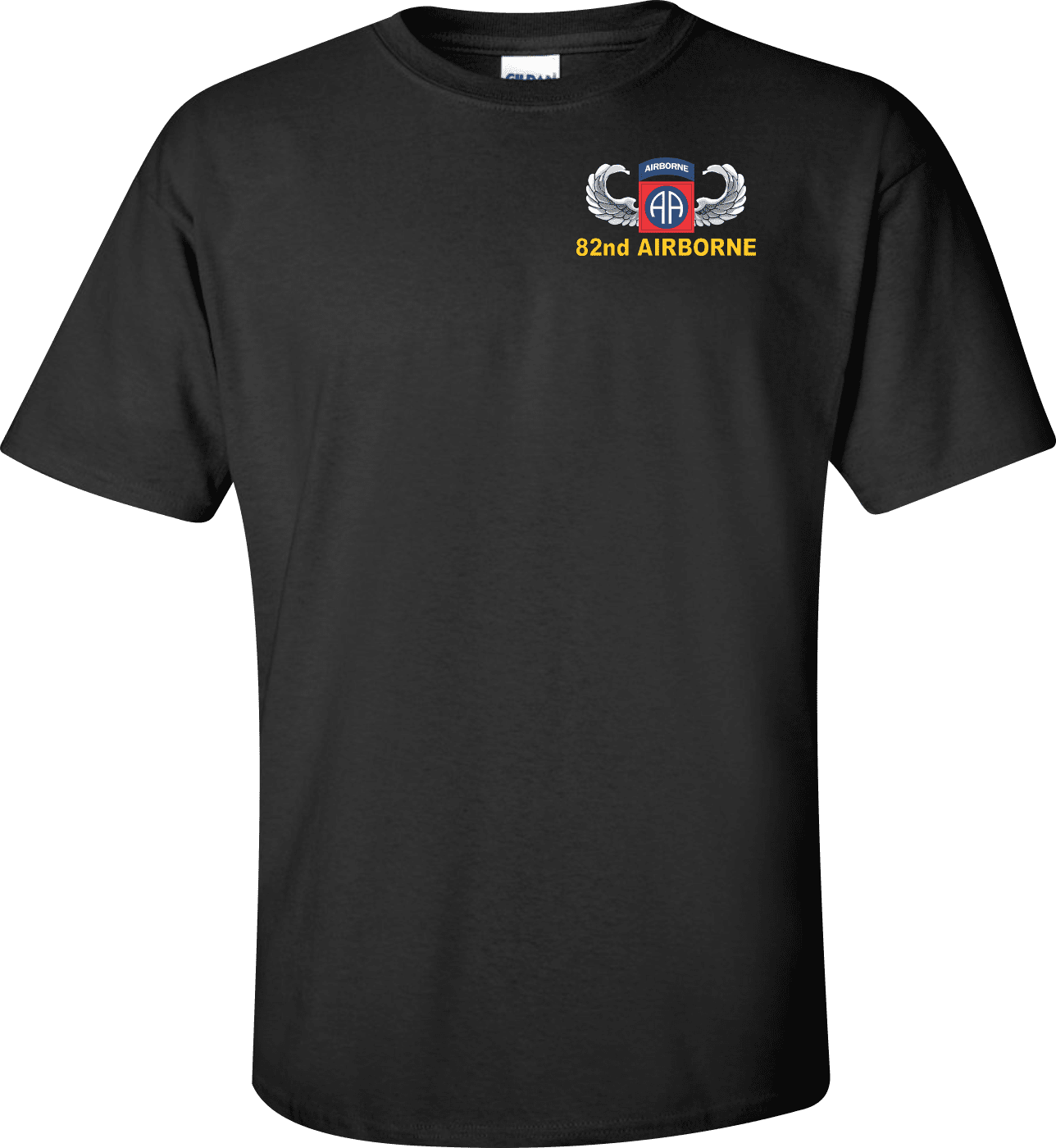 MilitaryBest is proud to offer this fine U.S. Army 82nd Airborn With Jump Wings T-shirt. This shirt is available with several options for the image on the front of the shirt, as well as, offering a full-sized Insignia on the back. Each U.S. Army 82nd Airborn With Jump Wings T-shirt is proudly printed in the USA.Unless there is a defect in workmanship or material, these shirts are unreturnable.