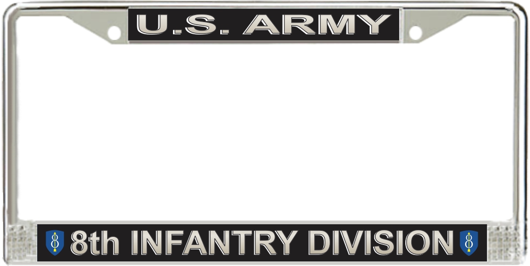 U.S. Army 8th Infantry Division License Plate FrameThis U.S. Army 8th Infantry Division License Plate Frame is made from the highest quality finished metal alloy. Each one is designed to provide years of use. Each is designed and produced in our facility in Scottsboro, Alabama.