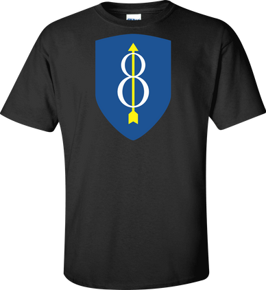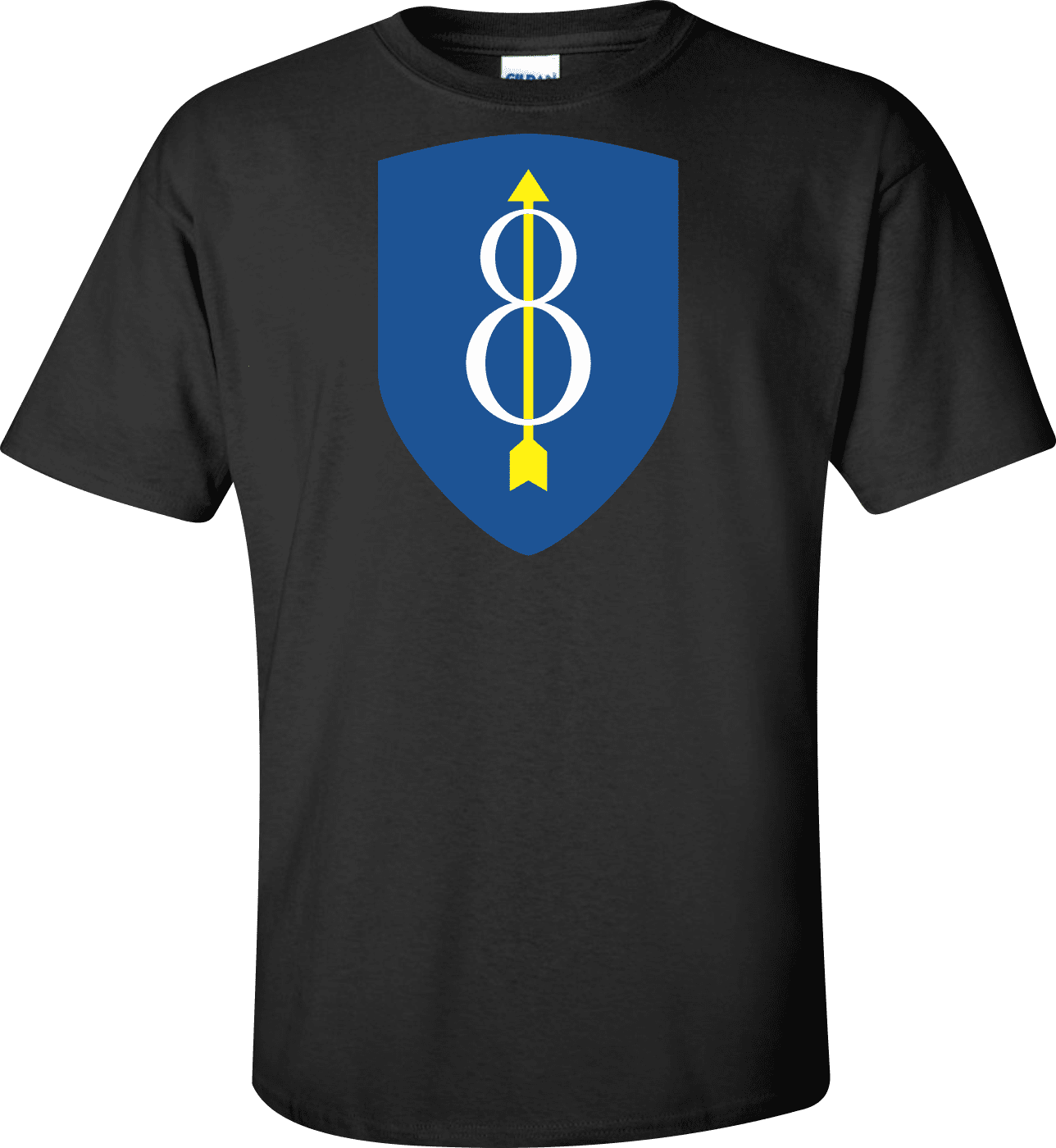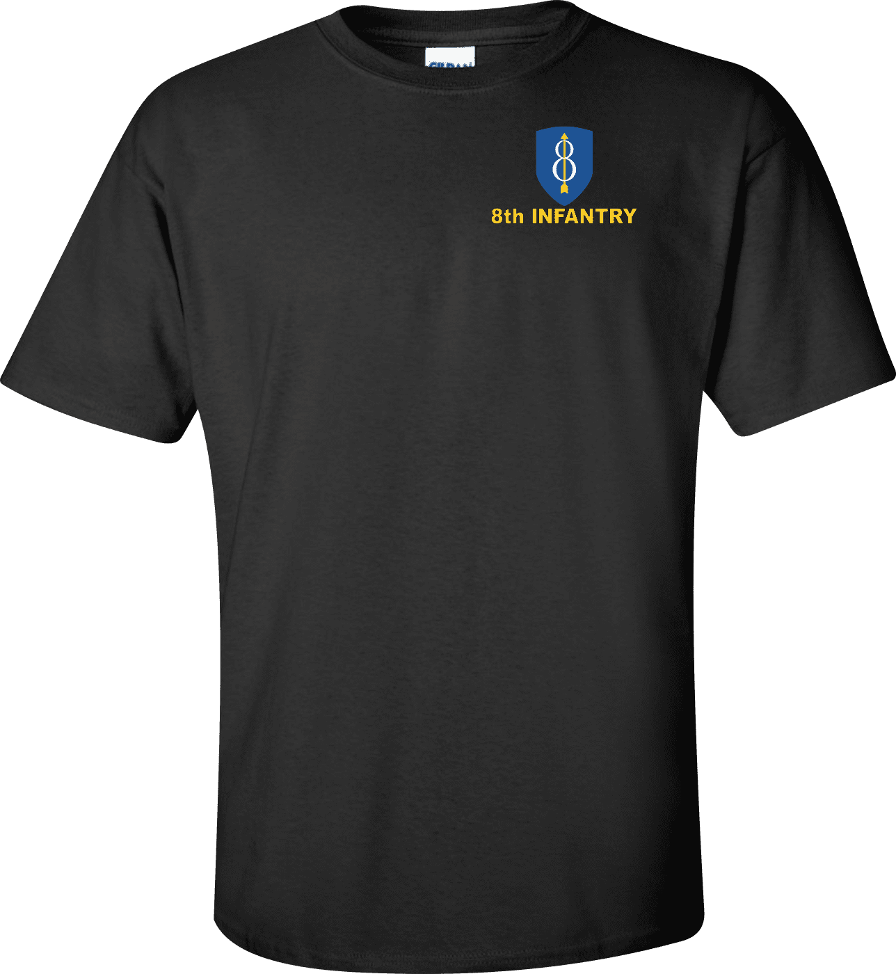 MilitaryBest is proud to offer this fine U.S. Army 8th Infantry Division T-shirt. This shirt is available with several options for the image on the front of the shirt, as well as, offering a full-sized Insignia on the back. Each U.S. Army 8th Infantry Division T-shirt is proudly printed in the USA.Unless there is a defect in workmanship or material, these shirts are unreturnable.