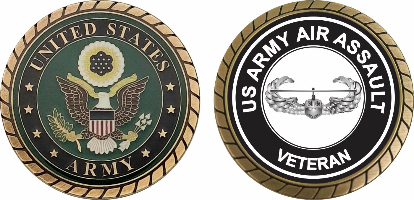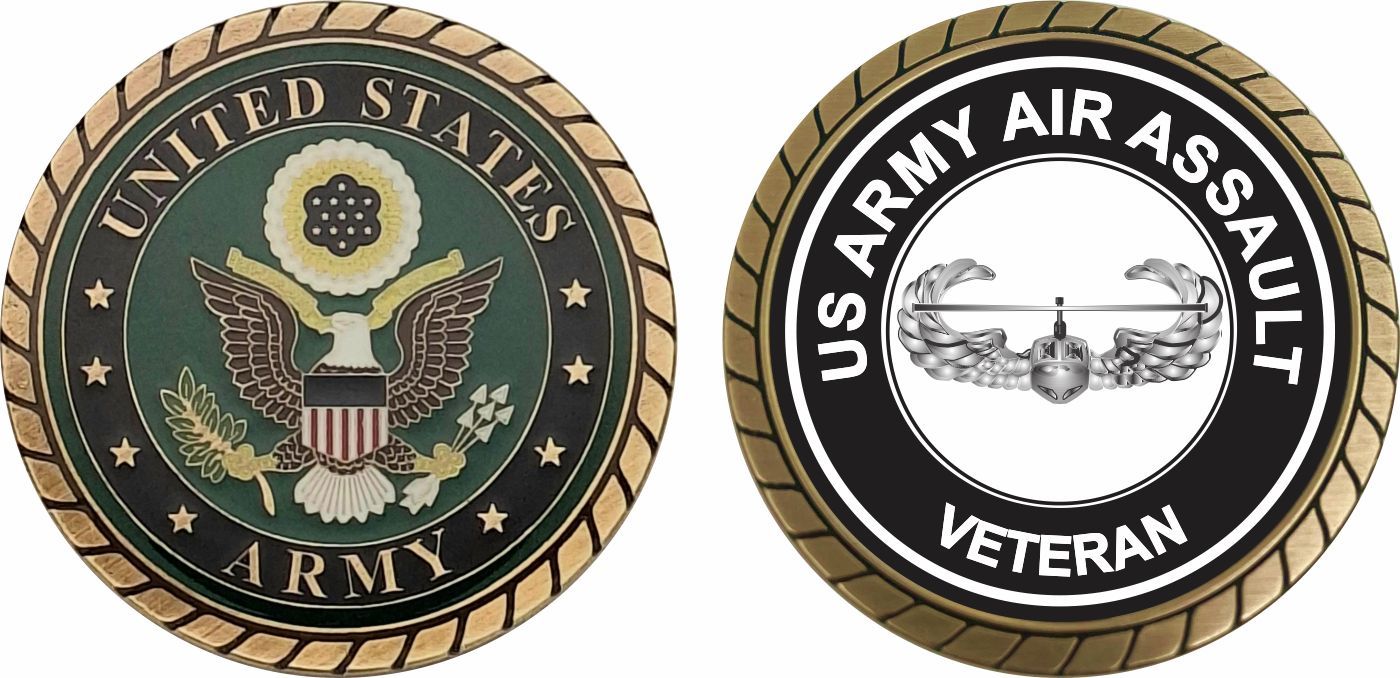This 1 3/4” U.S. Army Air Assault Veteran Challenge Coin is proudly offered by MilitaryBest. This Officially Licensed Army coin has beautiful enamel finish on one side and an organized crisp clean U.S. Army Air Assault Veteran design on the opposite side.