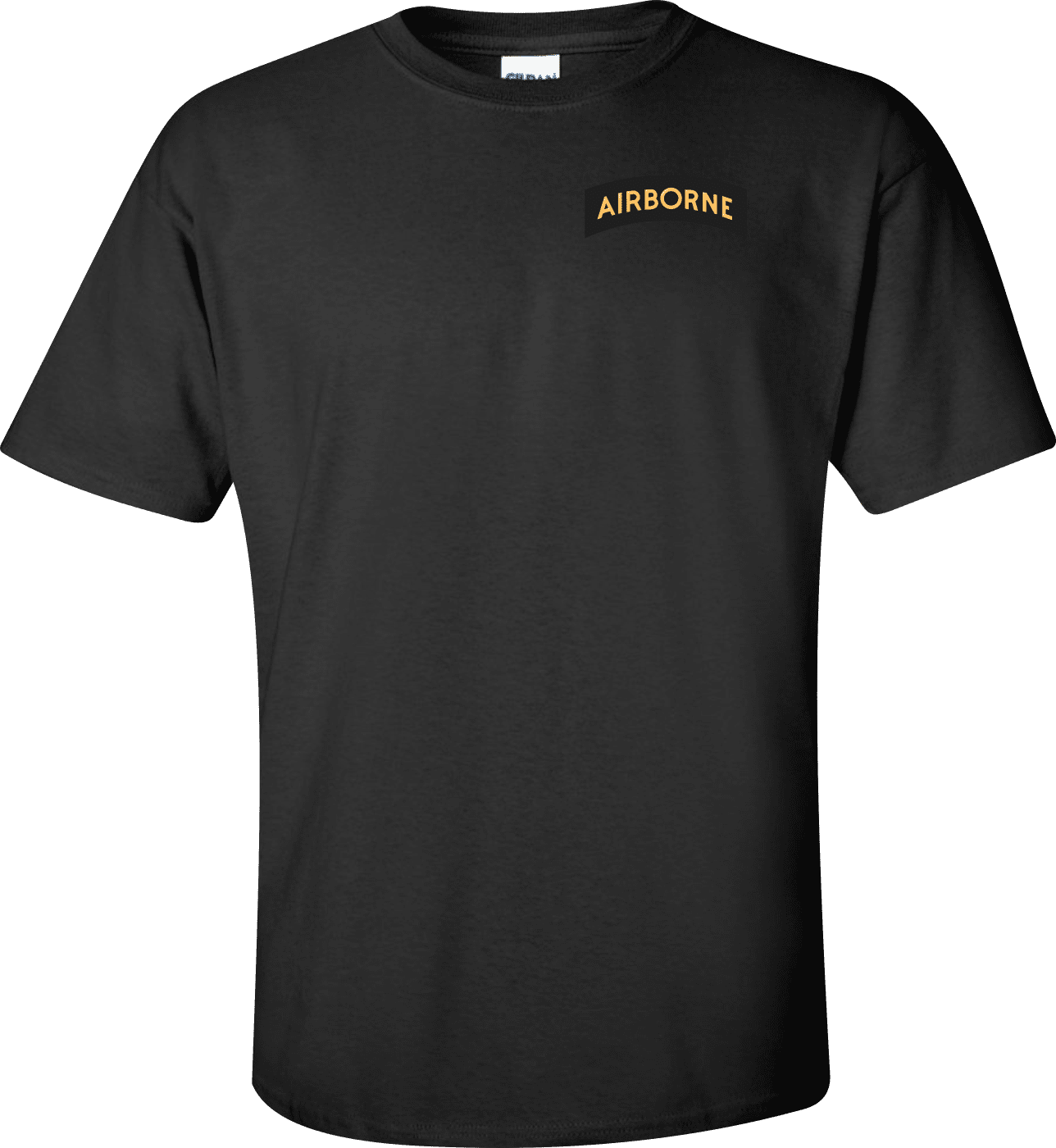 MilitaryBest is proud to offer this fine U.S. Army Airbone Tab T-shirt. This shirt is available with several options for the image on the front of the shirt, as well as, offering a full-sized Insignia on the back. Each U.S. Army Airbone Tab T-shirt is proudly printed in the USA.Unless there is a defect in workmanship or material, these shirts are unreturnable.