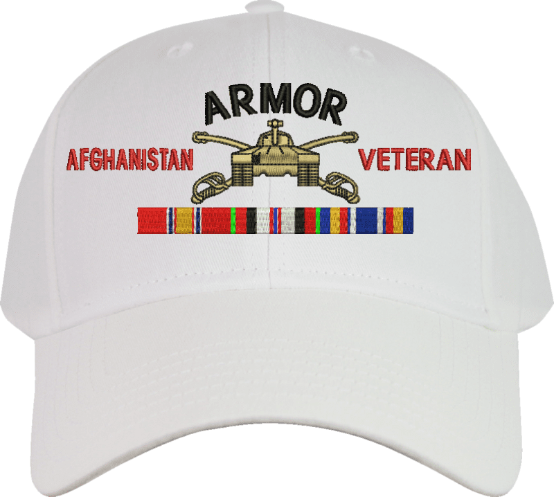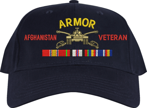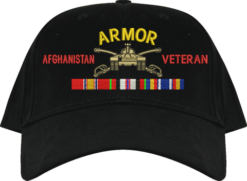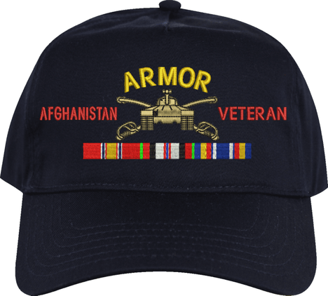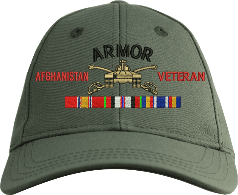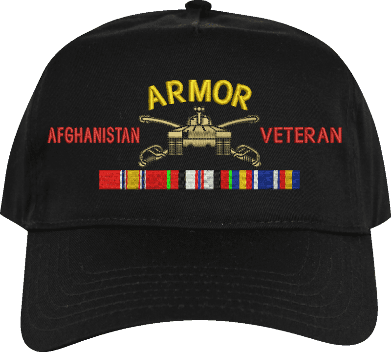 MilitaryBest is proud to offer this U.S. Army Armor Afghanistan Veteran Embroidered Cap. This cap is available in a 5 panel high profile or 6 panel low profile styling. All our caps are made from top quality materials. This cap would make a wonderful addition to your collection or a great gift! All custom embroidery is done at our facility in Scottsboro, AL. *Caps ordered with embroidered back text requires an additional 1 to 2 days of production time. All personalized caps will be embroidered in ALL CAPITAL LETTERS. Caps personalized with back text are not returnable unless there is a material defect in the cap.A percentage of the sale of each MilitaryBest item is forwarded to the licensing departments of each respective branch of service in support of the MWR (Morale, Welfare, & Recreation) program. These payments are made by either ALL4U LLC or the wholesaler from where the item originated. Our team thanks you for your service and your support of these programs.