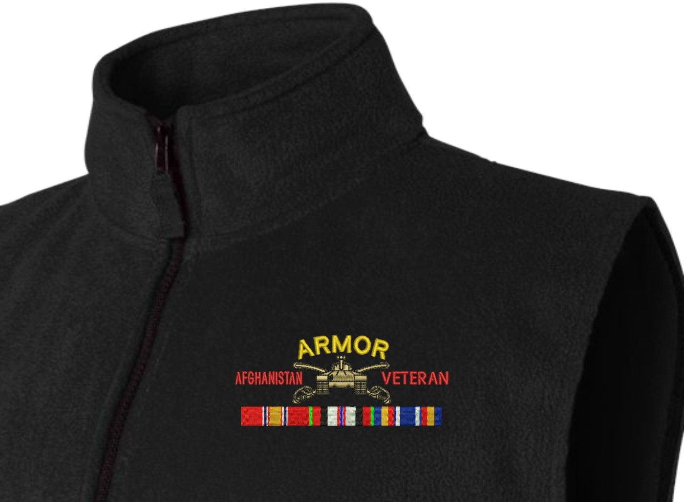 Note: Due to supply chain disruptions, some colors and sizes may not be available in the same Brand, in these cases a brand of comparable quality will be used. Feel free to call in advance of your order, with questions you may have.MilitaryBest is proud to offer this quality U.S. Army Armor Afghanistan Veteran Fleece Vest. This Fleece Vest features a convertible collar with dyed-to-match zipper pull, oversized nylon reinforced slash pockets, and an elastic hem. It is made using a 100% anti-pill polyester Fleece Vest. This Fleece Vest will make an excellent addition to your wardrobe, or a quality gift. Your satisfaction is guaranteed! These quality fleece vests are proudly embroidered at our facilities in Scottsboro, AL. Support the Army MWR program by purchasing only from Licensed Vendors.