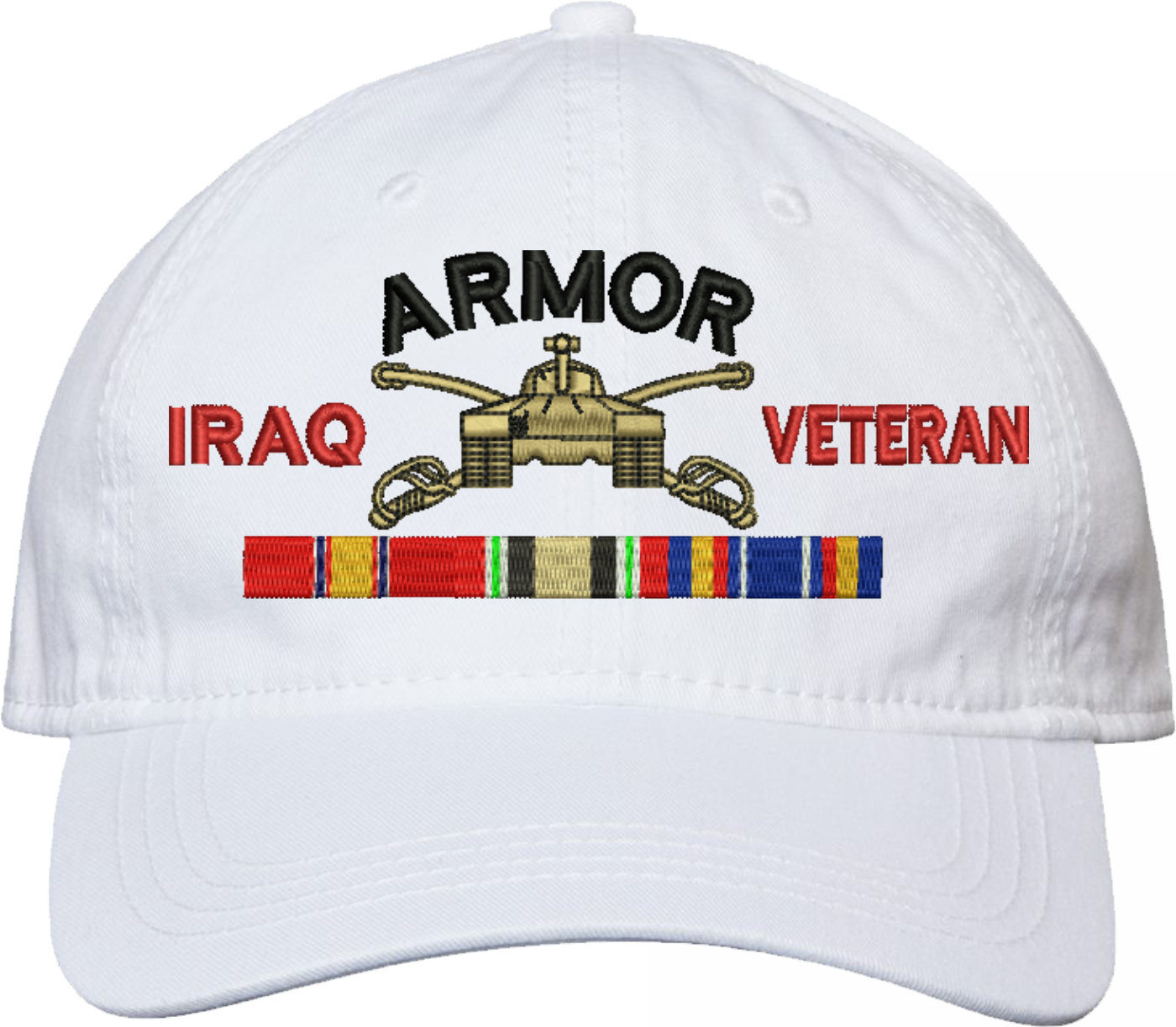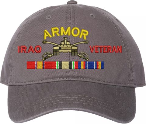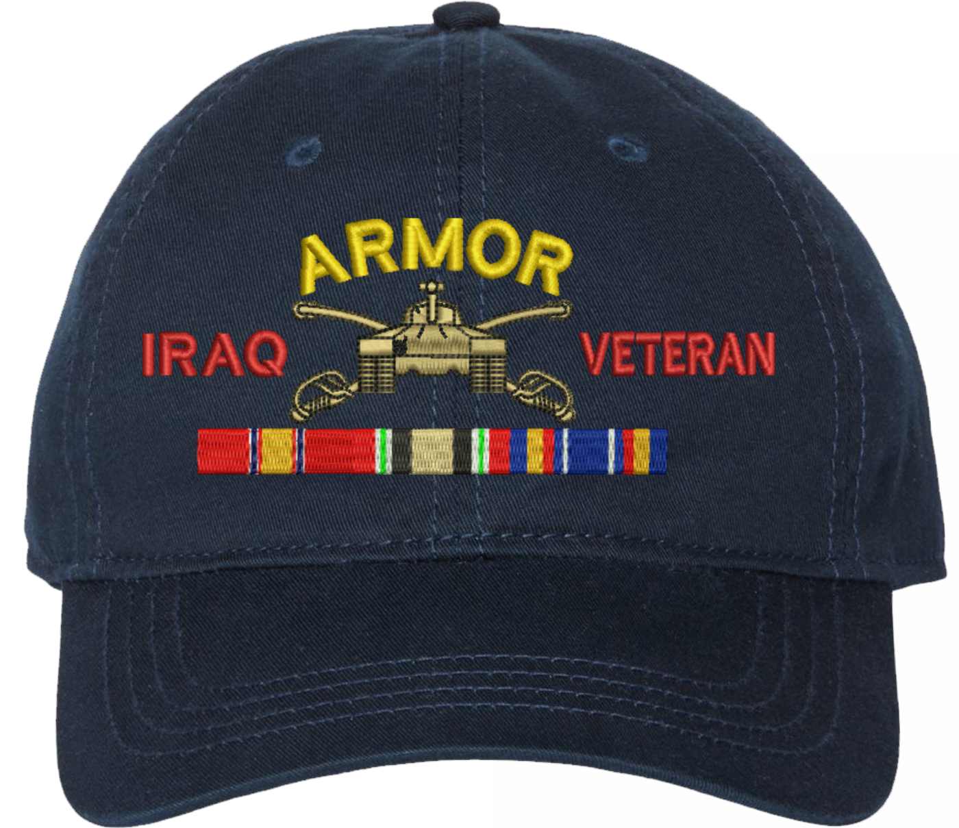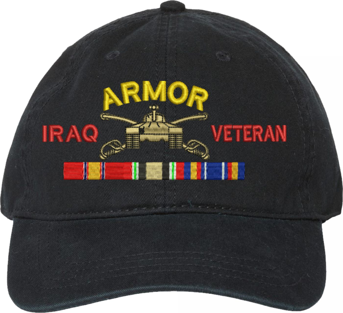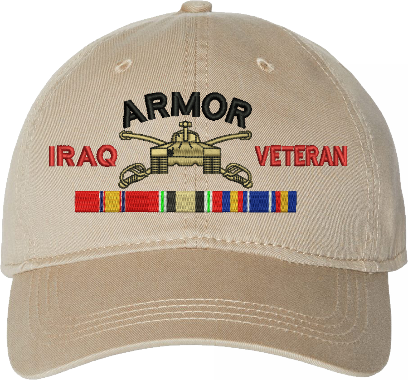 Show your Army pride with this U.S. Army Armor Iraq Veteran Unstructured Dad Cap from MilitaryBest. Crafted from 100% washed chino twill cotton, this six-panel, low-profile cap offers a relaxed and comfortable fit. Featuring high-quality embroidery done in our Scottsboro, Alabama facility, this cap is designed with a pre-curved visor and an adjustable tri-glide buckle closure for a perfect fit. Whether for everyday wear or as a meaningful gift, this cap is a great way to honor your own or a loved one's service.For caps ordered with custom embroidered personalized text please allow an additional 3 to 5 days production time. All custom back text will be embroidered in ALL CAPITAL LETTERS. Caps with back text or eggs are non-returnable unless there is a material defect in the cap.