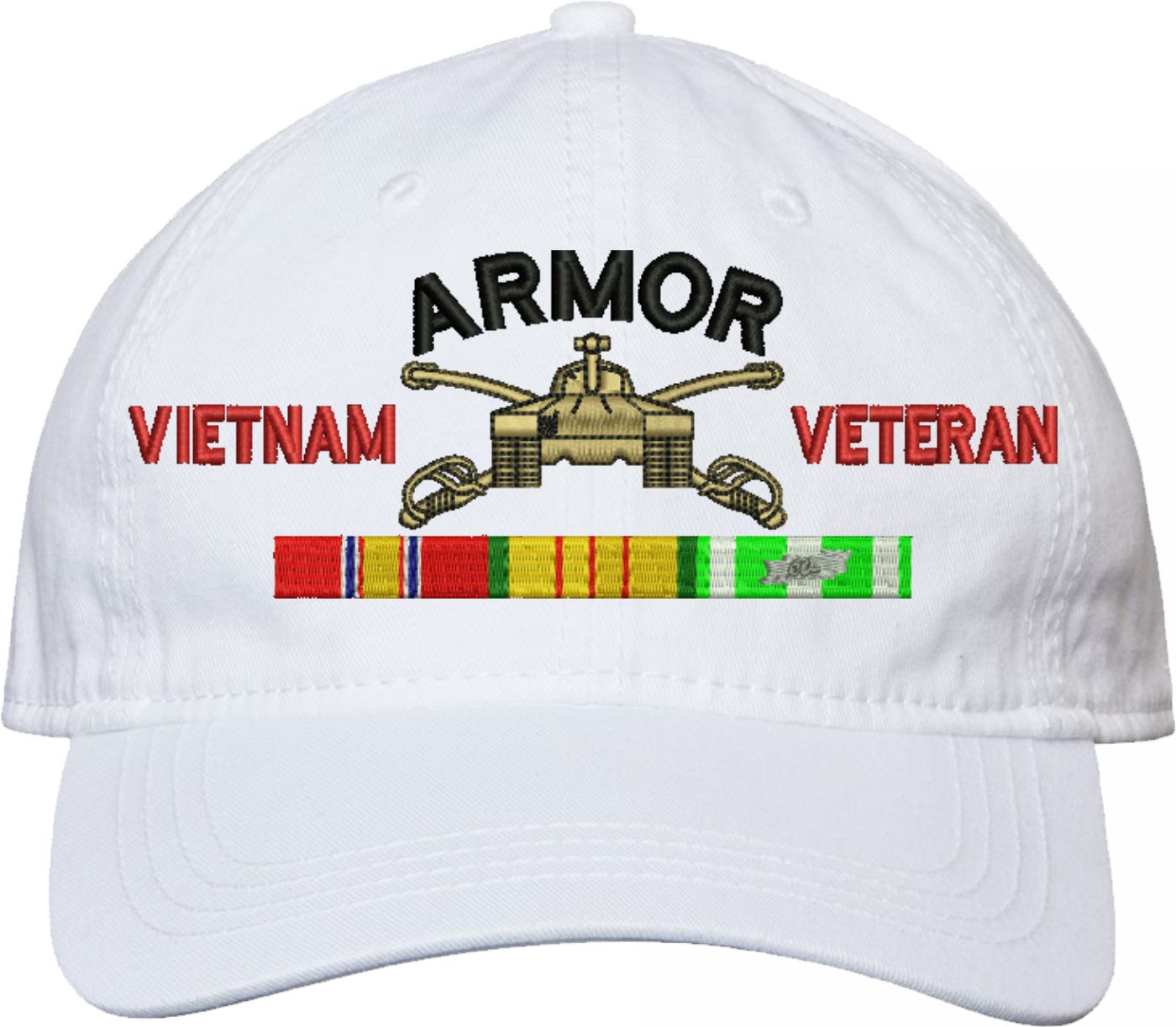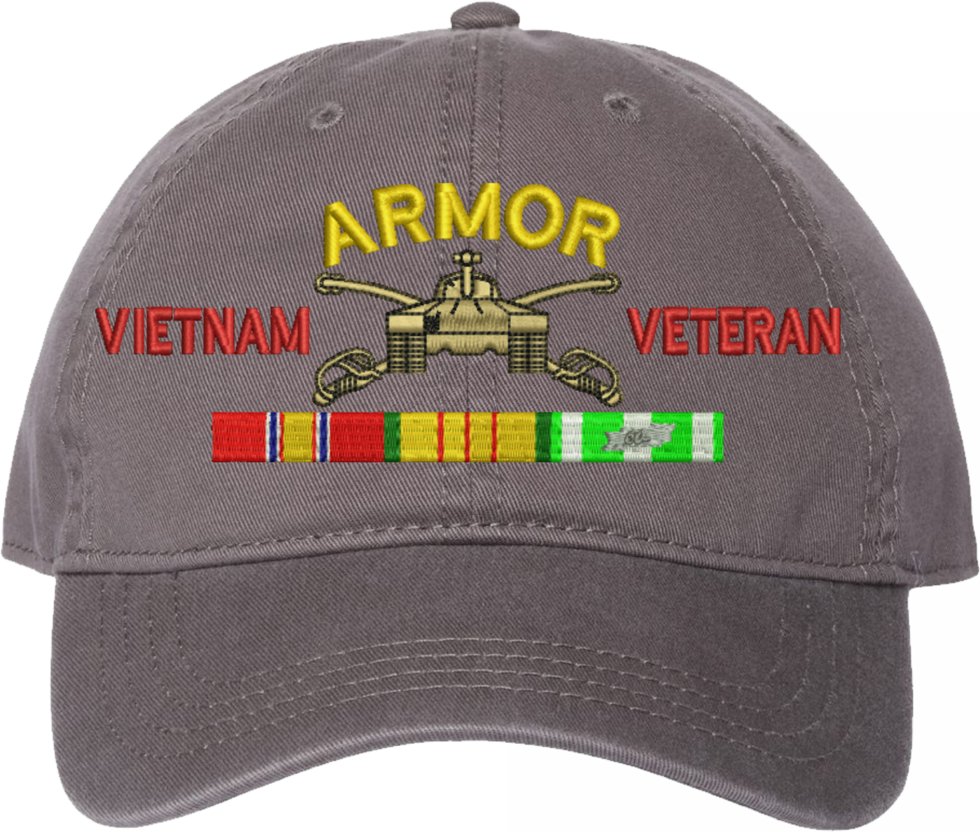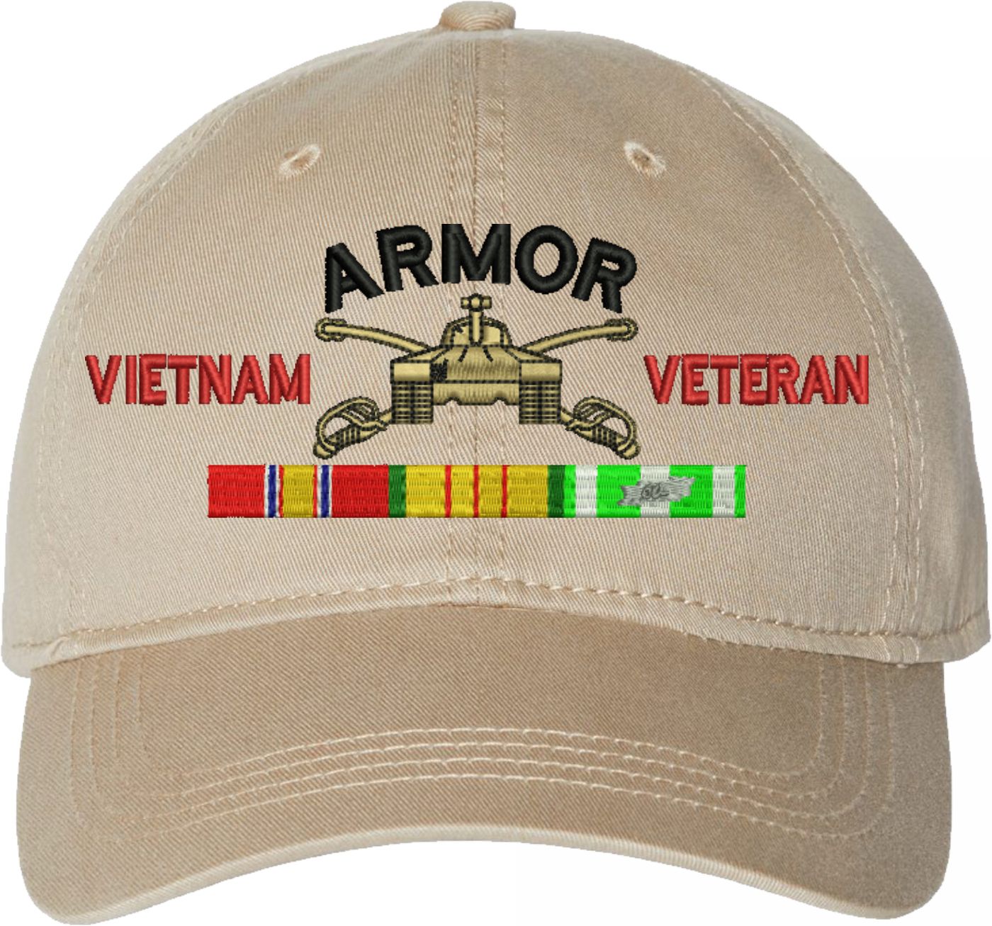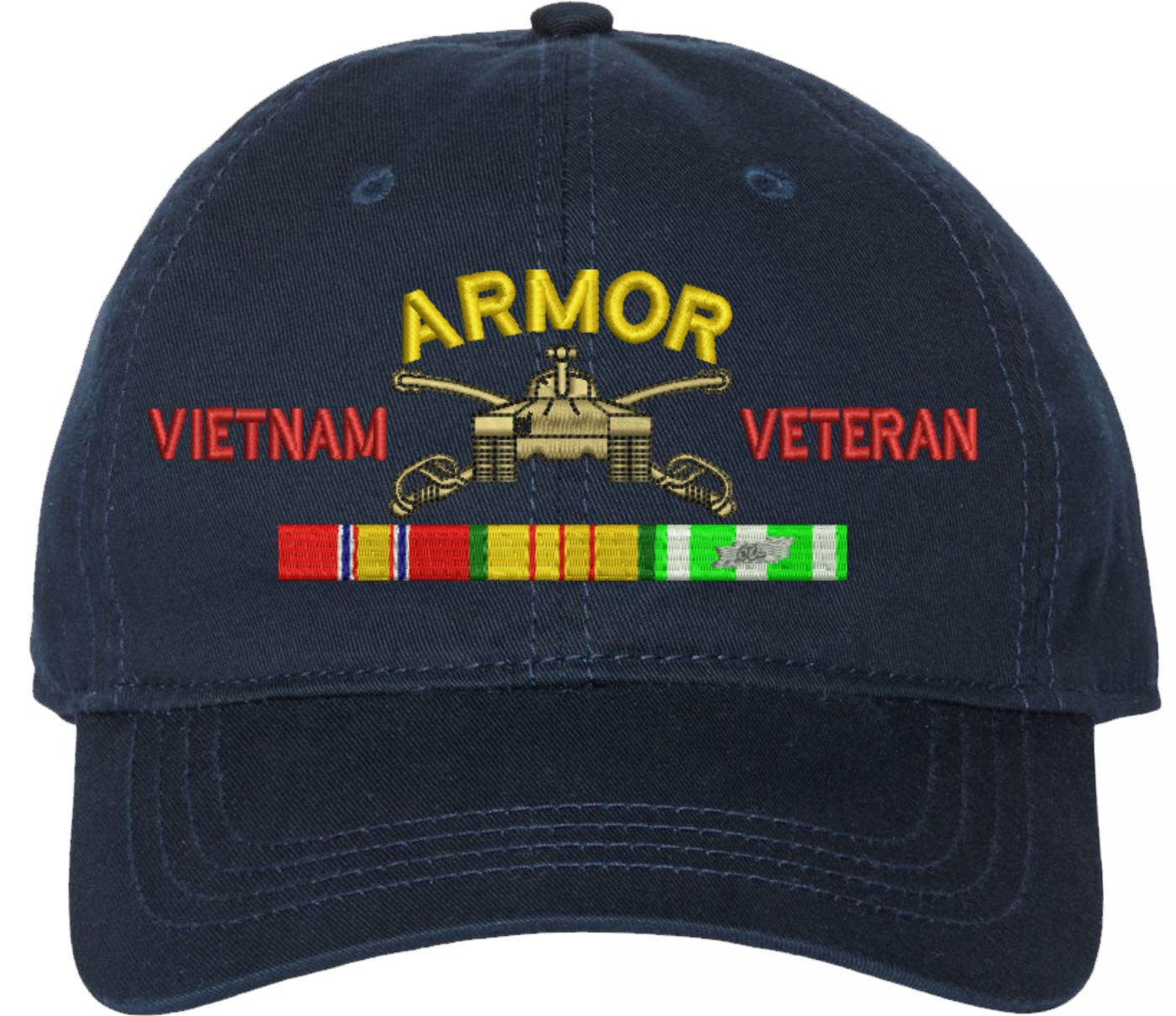 Show your Army pride with this U.S. Army Armor Vietnam Veteran Unstructured Dad Cap from MilitaryBest. Crafted from 100% washed chino twill cotton, this six-panel, low-profile cap offers a relaxed and comfortable fit. Featuring high-quality embroidery done in our Scottsboro, Alabama facility, this cap is designed with a pre-curved visor and an adjustable tri-glide buckle closure for a perfect fit. Whether for everyday wear or as a meaningful gift, this cap is a great way to honor your own or a loved one's service.For caps ordered with custom embroidered personalized text please allow an additional 3 to 5 days production time. All custom back text will be embroidered in ALL CAPITAL LETTERS. Caps with back text or eggs are non-returnable unless there is a material defect in the cap.