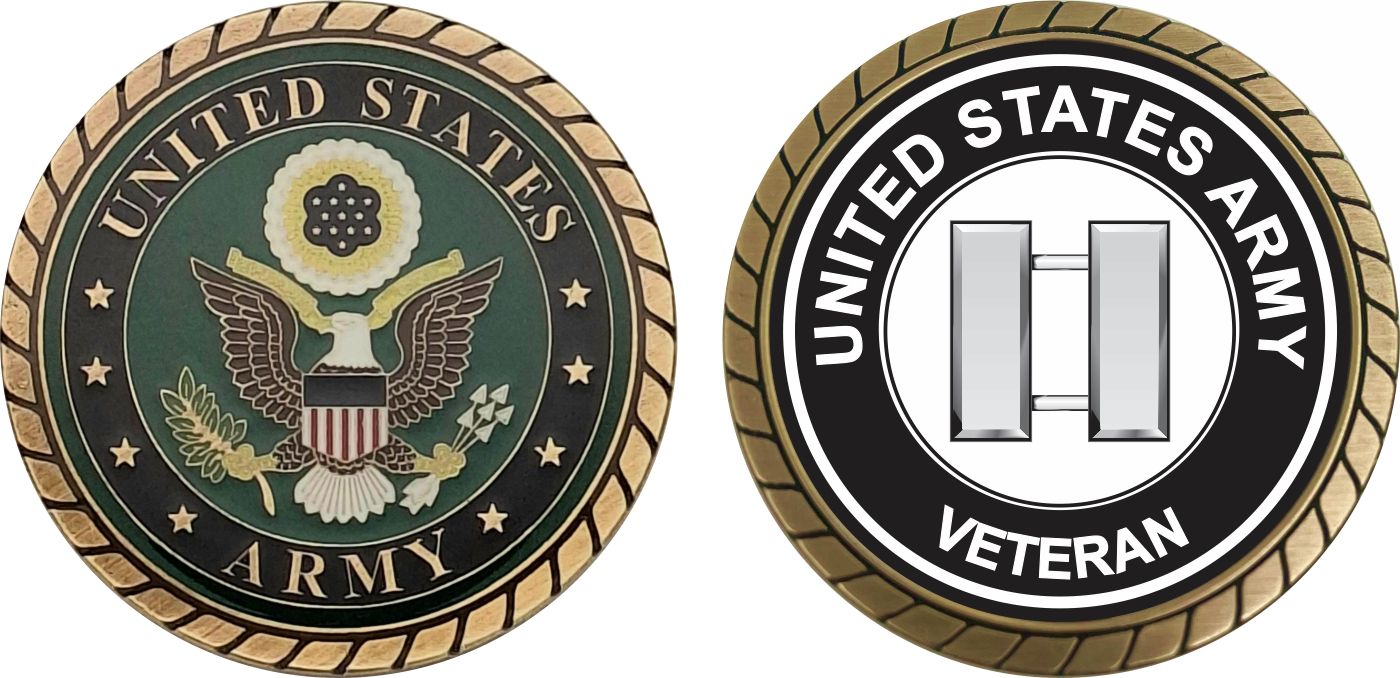 This 1 3/4” U.S. Army Captain Veteran Challenge Coin is proudly offered by MilitaryBest. This Officially Licensed Army coin has beautiful enamel finish on one side and an organized crisp clean U.S. Army Captain Veteran design on the opposite side.