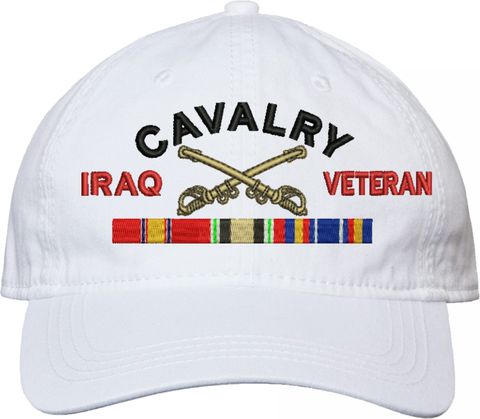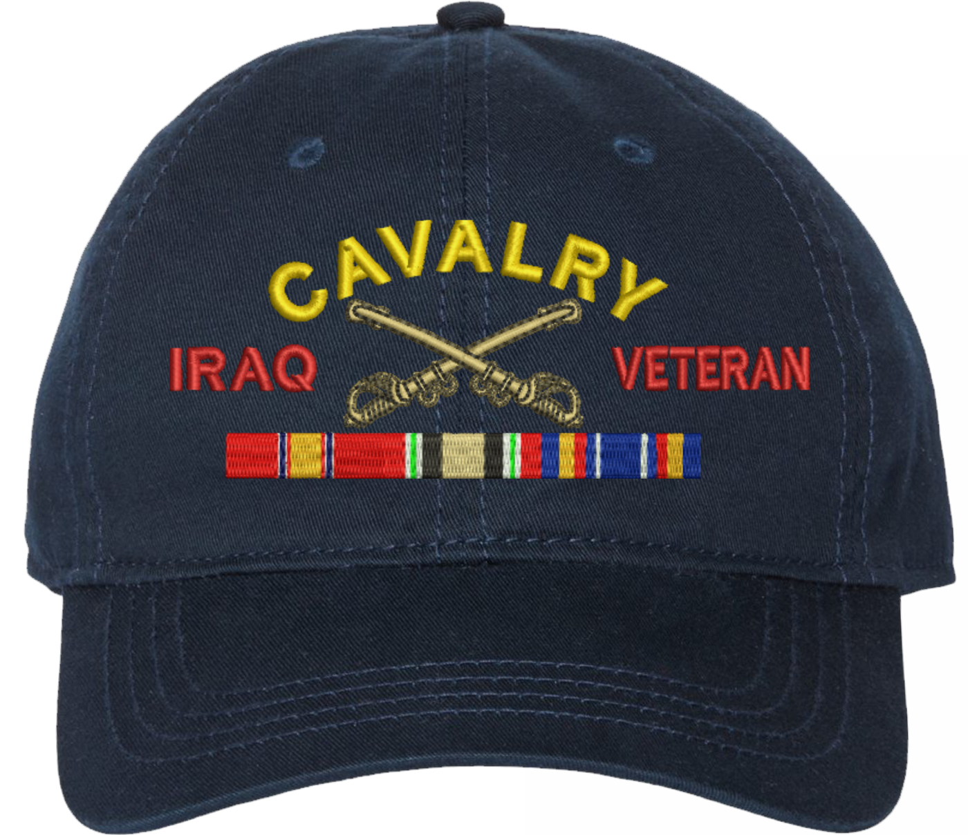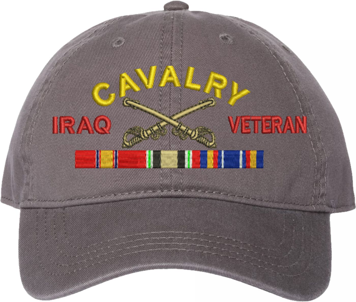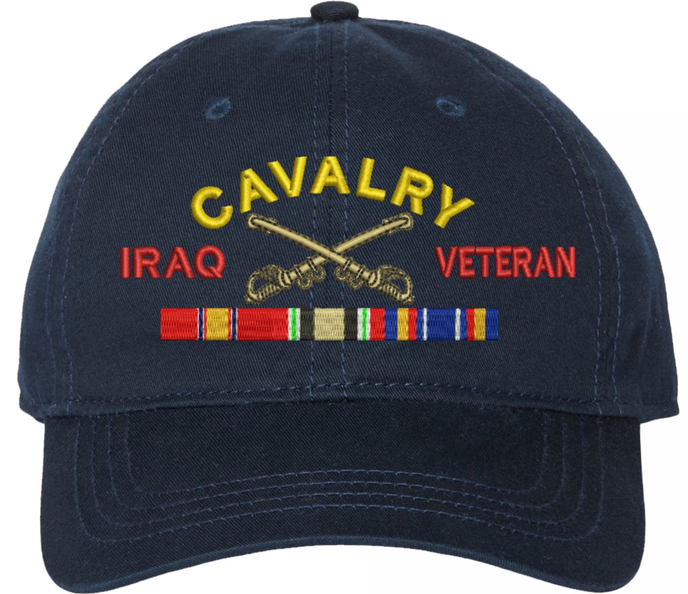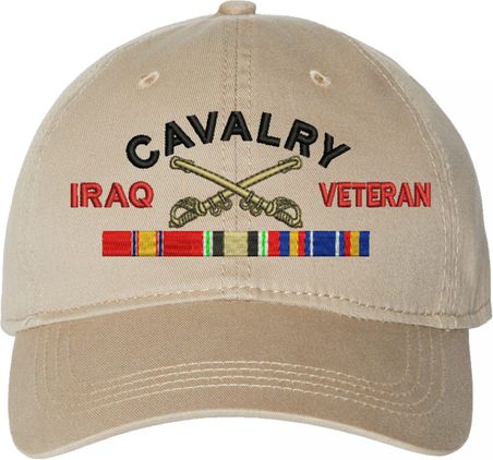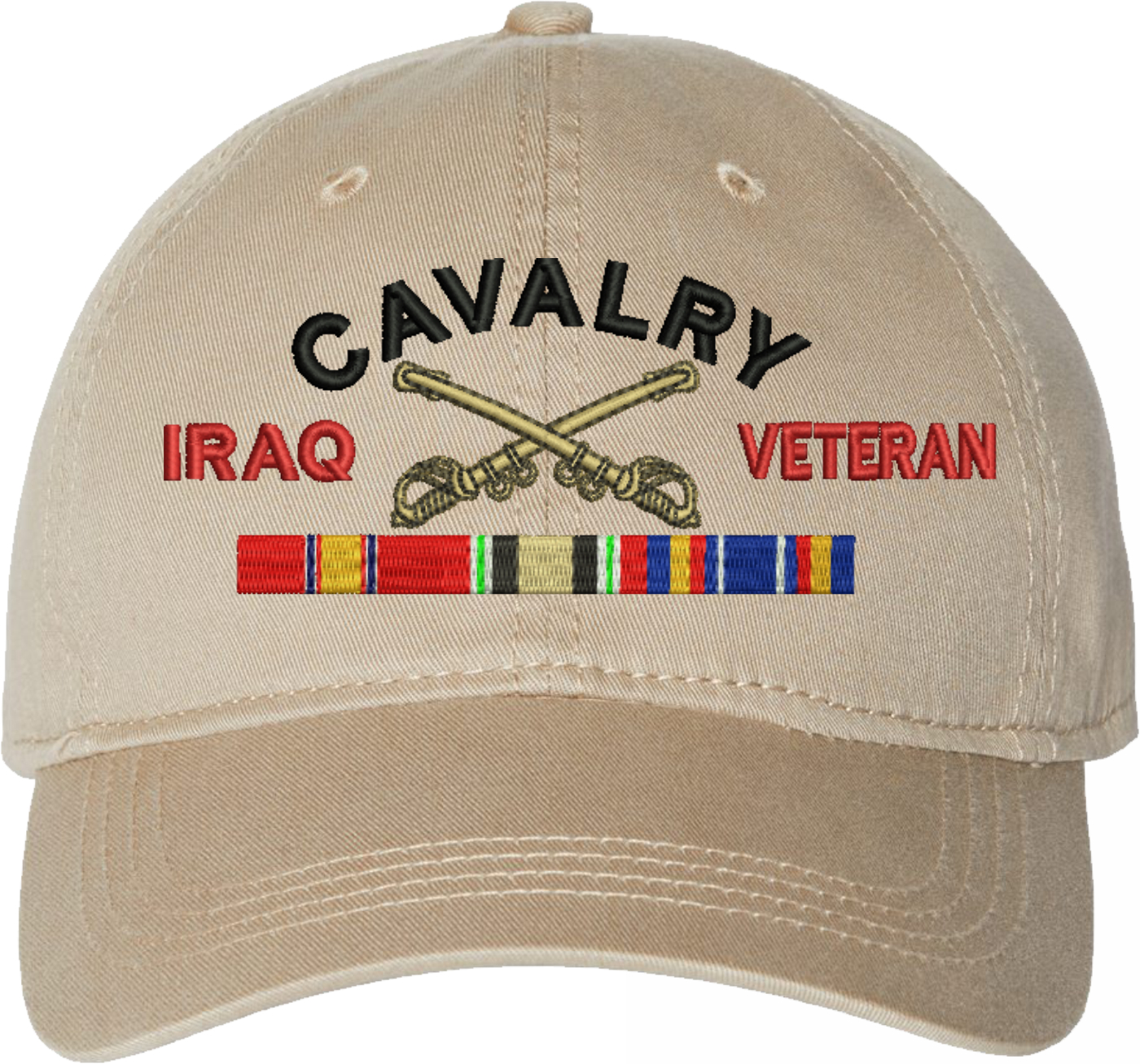Show your Army pride with this U.S. Army Cavalry Iraq Veteran Unstructured Dad Cap from MilitaryBest. Crafted from 100% washed chino twill cotton, this six-panel, low-profile cap offers a relaxed and comfortable fit. Featuring high-quality embroidery done in our Scottsboro, Alabama facility, this cap is designed with a pre-curved visor and an adjustable tri-glide buckle closure for a perfect fit. Whether for everyday wear or as a meaningful gift, this cap is a great way to honor your own or a loved one's service.For caps ordered with custom embroidered personalized text please allow an additional 3 to 5 days production time. All custom back text will be embroidered in ALL CAPITAL LETTERS. Caps with back text or eggs are non-returnable unless there is a material defect in the cap.