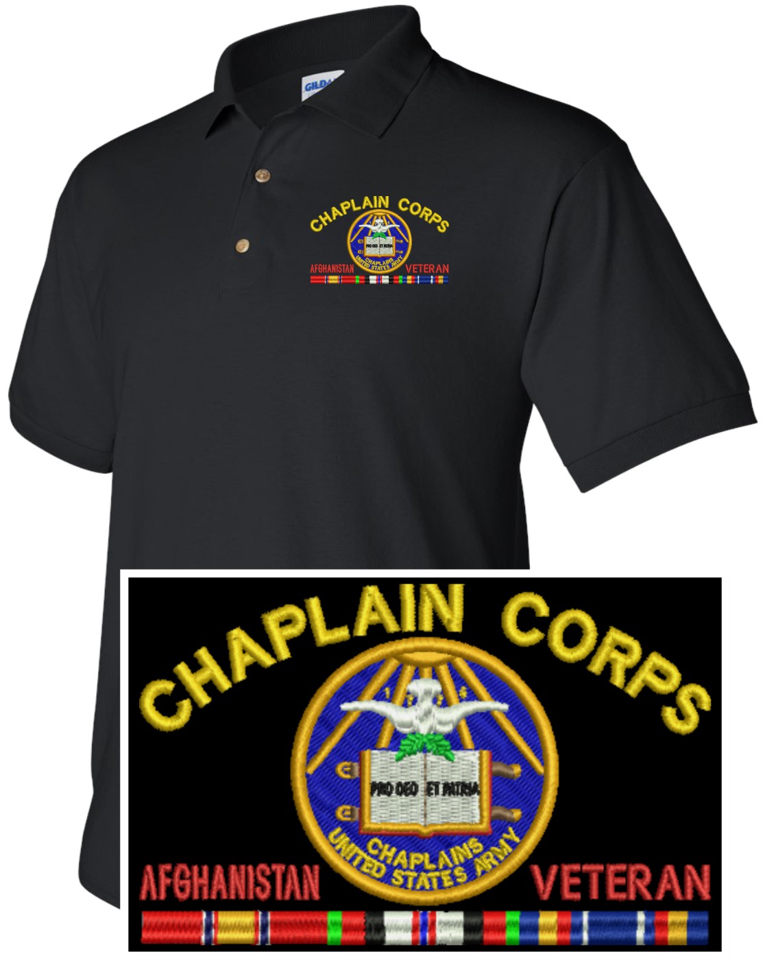 MilitaryBest is proud to offer this quality U.S. Army Chaplain Corps Afghanistan Veteran Polo. Each Polo is available in either 100% Ringspun cotton pique or a 50/50 cotton/polyester blend. These quality Military Polos are proudly embroidered at our facilities in Scottsboro, AL. Support the Army MWR program by purchasing only from Licensed Vendors.