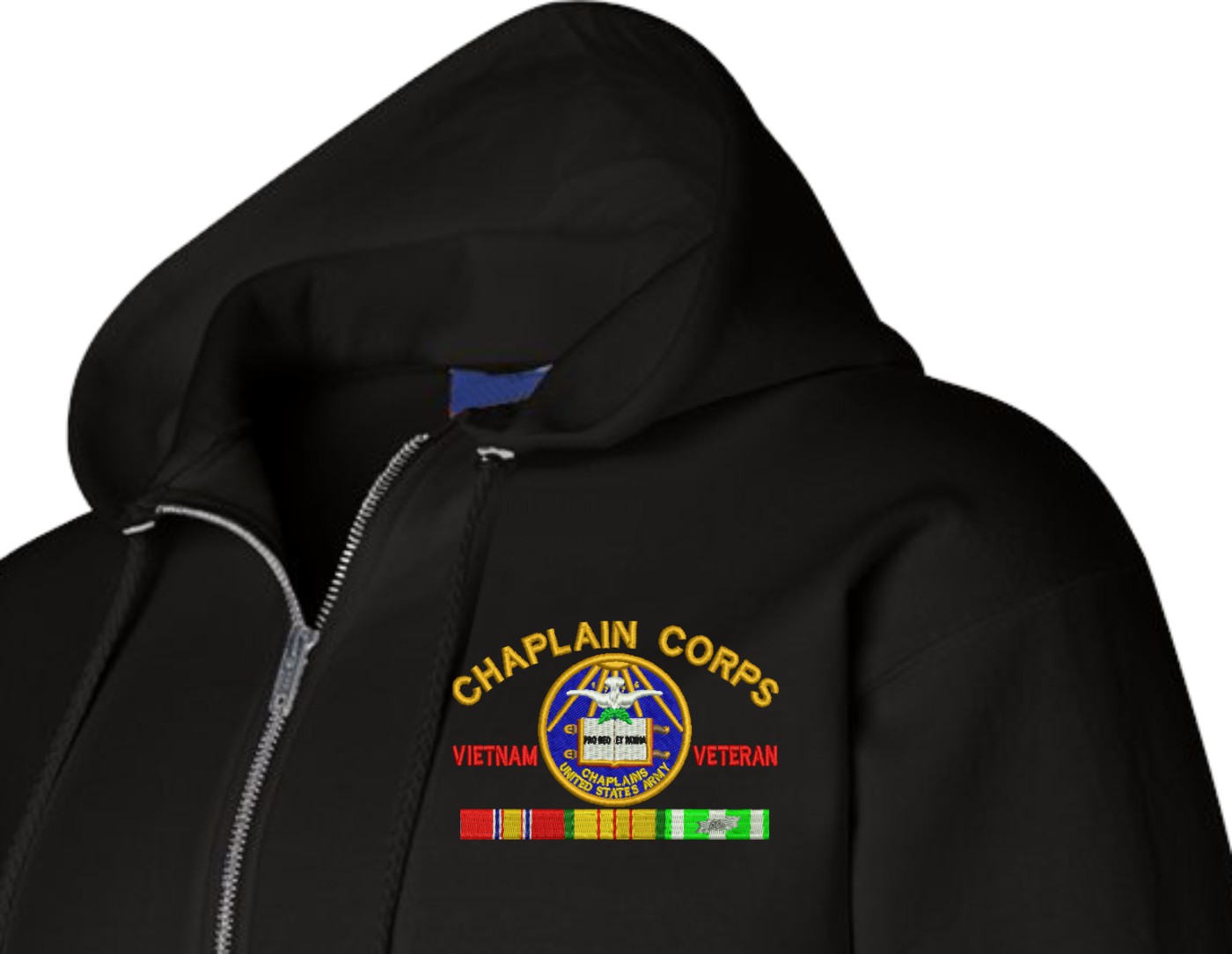 MilitaryBest has expanded its line of apparel with this custom embroidered U.S. Army Chaplain Corps Vietnam Veteran Zippered Hoodie. Each Hoodie is direct embroidered onto a Champion brand 9.5 oz 50/50 Cotton Poly blend. This will make an excellent addition to your wardrobe, or a great gift. Your satisfaction is Guaranteed! These quality zippered hoodies are proudly embroidered at our facilities in Scottsboro, AL. Support the Army MWR program by purchasing only from Licensed Vendors. To all of our Vietnam Veterans, Welcome Home!
